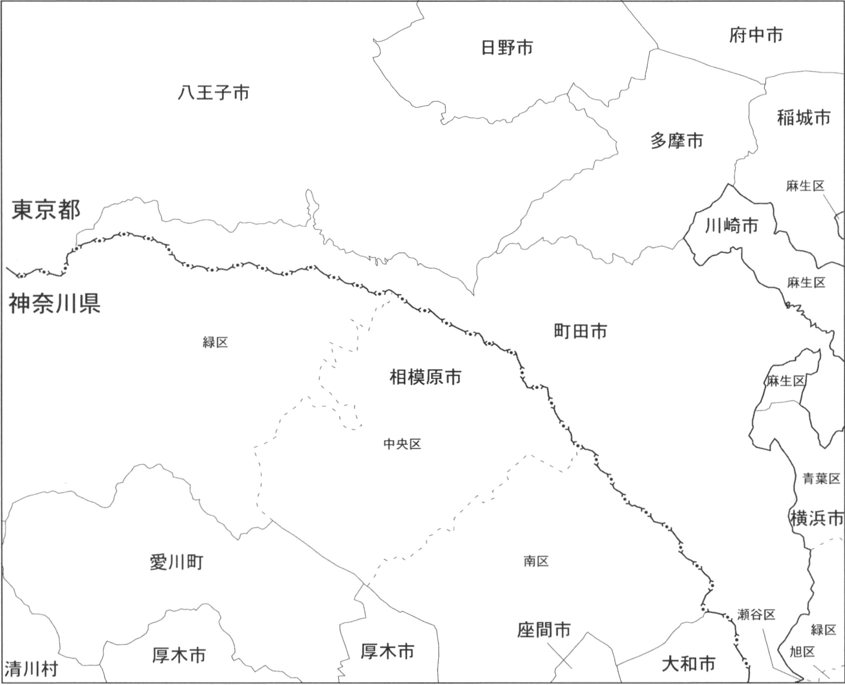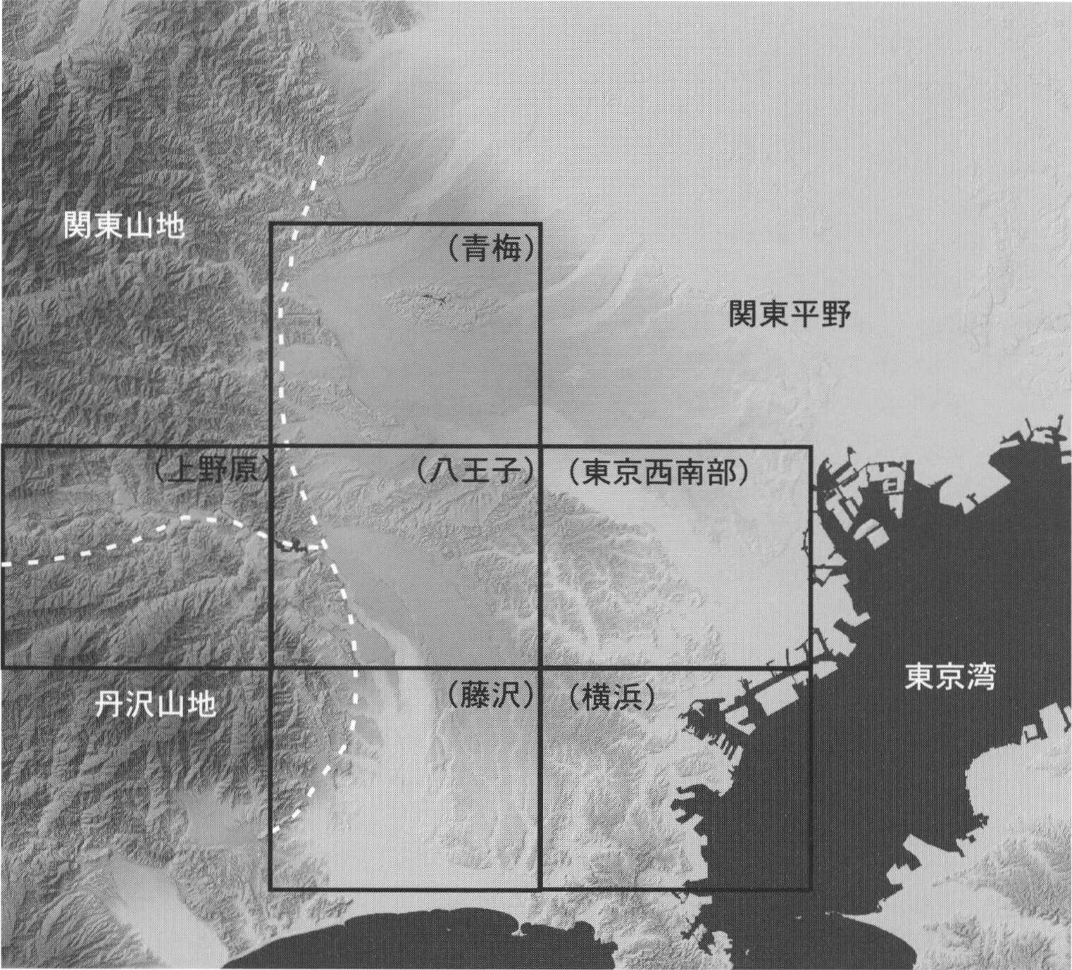 八王子地域は,世界測地系で北緯35°30′11″6~35°40′11″6,東経139°14′48″5~139°29′48″4(日本測地系で北緯35°30′~35°40′,東経139°15′~139°30′)の範囲を占め,関東山地と関東平野の境界に位置する(第1.1図).八王子地域の行政区分は,東京都八王子市,日野市,多摩市,府中市,稲城市,町田市,神奈川県相模原市,愛甲郡愛川町,愛甲郡清川村,厚木市,座間市,大和市,横浜市,川崎市が含まれる(第1.2図).2010年4月に,旧相模原市は旧津久井郡の城山町,津久井町,藤野町,相模湖町と合併して,緑区,中央区,南区からなる新しい相模原市になった.八王子地域には,これらの3つの区が全て含まれる.また,横浜市では青葉区,緑区,旭区,瀬谷区の4区,川崎市では麻生区が八王子地域に含まれる.