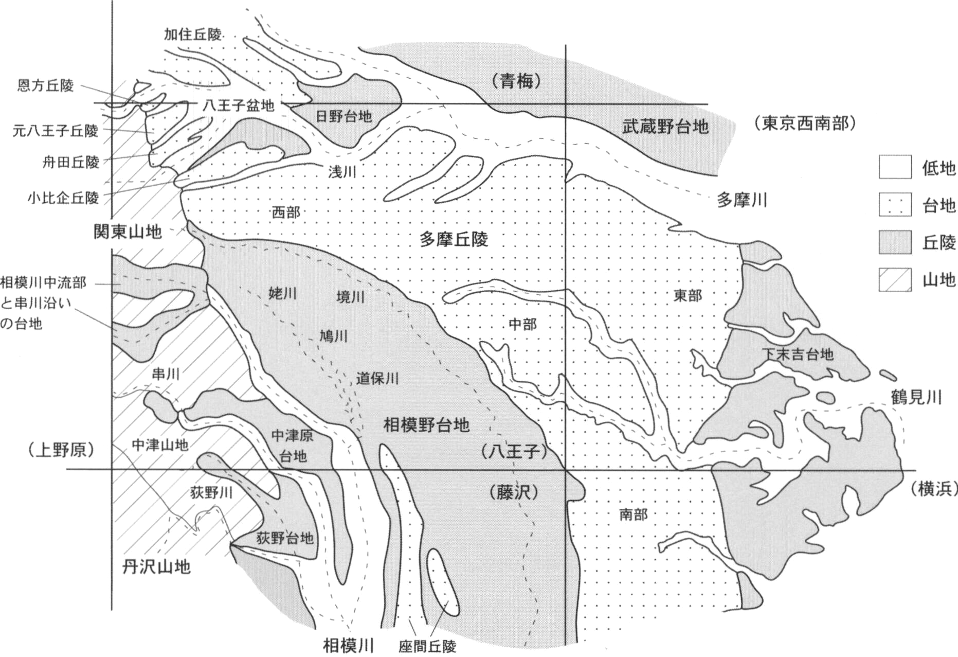 八王子地域には,加住丘陵の南東端が多摩川と浅川の間に分布する.恩方丘陵,元八王子丘陵,舟田丘陵(長房丘陵)の3つの小規模な丘陵は,北浅川と南浅川の間に分布し,東に向かって標高250mから150mに高度を減じる.小比企丘陵は浅川と湯殿川の間に分布し,南の多摩丘陵よりも比高が小さく,東に向かって標高200mから120mに高度を減じる.多摩丘陵は湯殿川と境川の間に分布し,八王子市・町田市の西部から横浜市東部・南部に至る.全体に,南東に向かって標高250mから50mに高度を減じる.相模野台地南部の座間丘陵は,南に向かって標高110mから50mに高度を減じる.