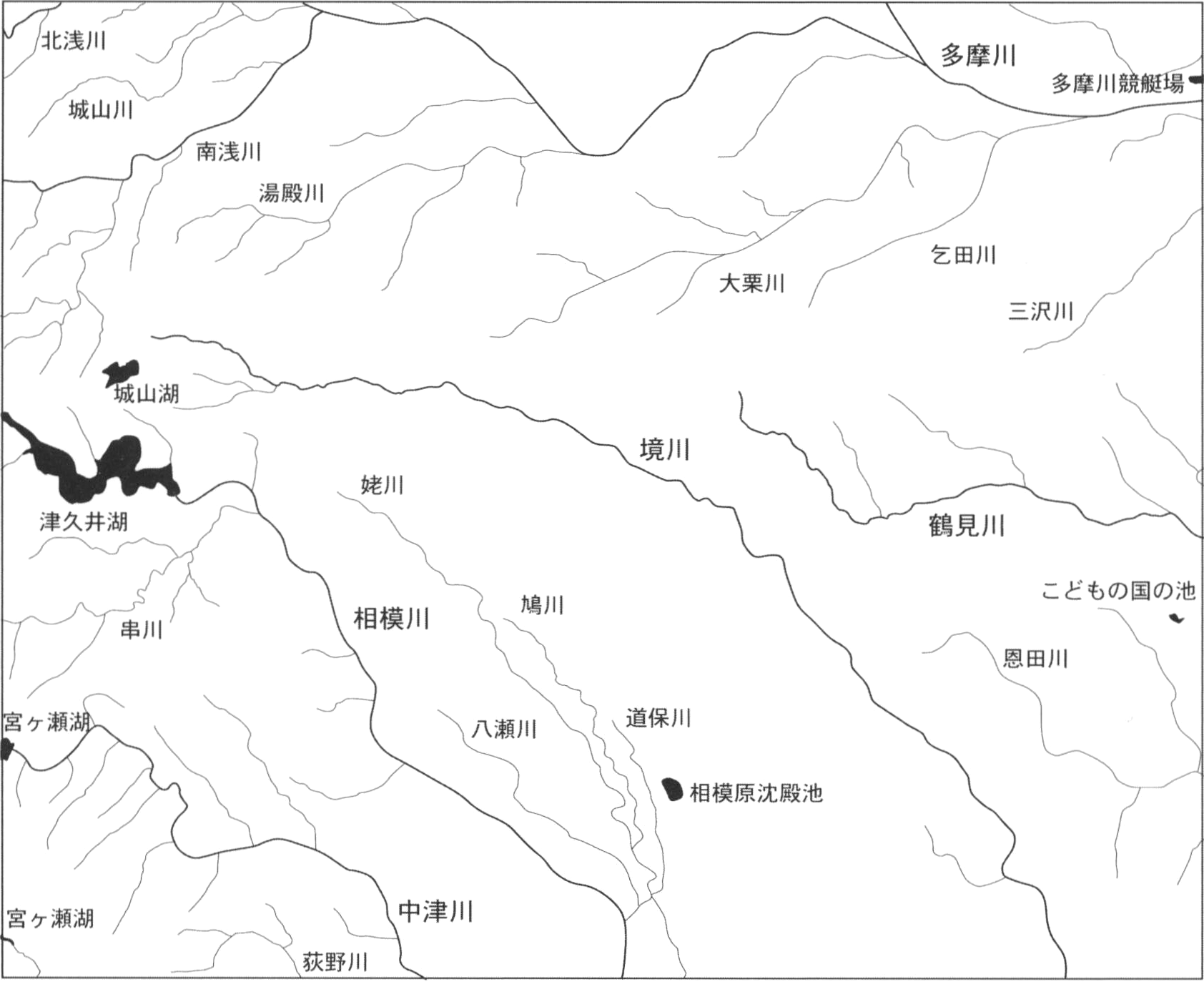 相模川中流部には城山ダムによる津久井湖,中津川には宮ヶ瀬ダムによる宮ヶ瀬湖,境川には本沢ダムによる城山湖の3つの大きな人造湖がある.主な人工の池としては,東京都府中市是政4丁目の多摩川競艇場,相模原市南区下溝の相模原沈殿池,横浜市青葉区奈良町のこどもの国の園内の池がある.
