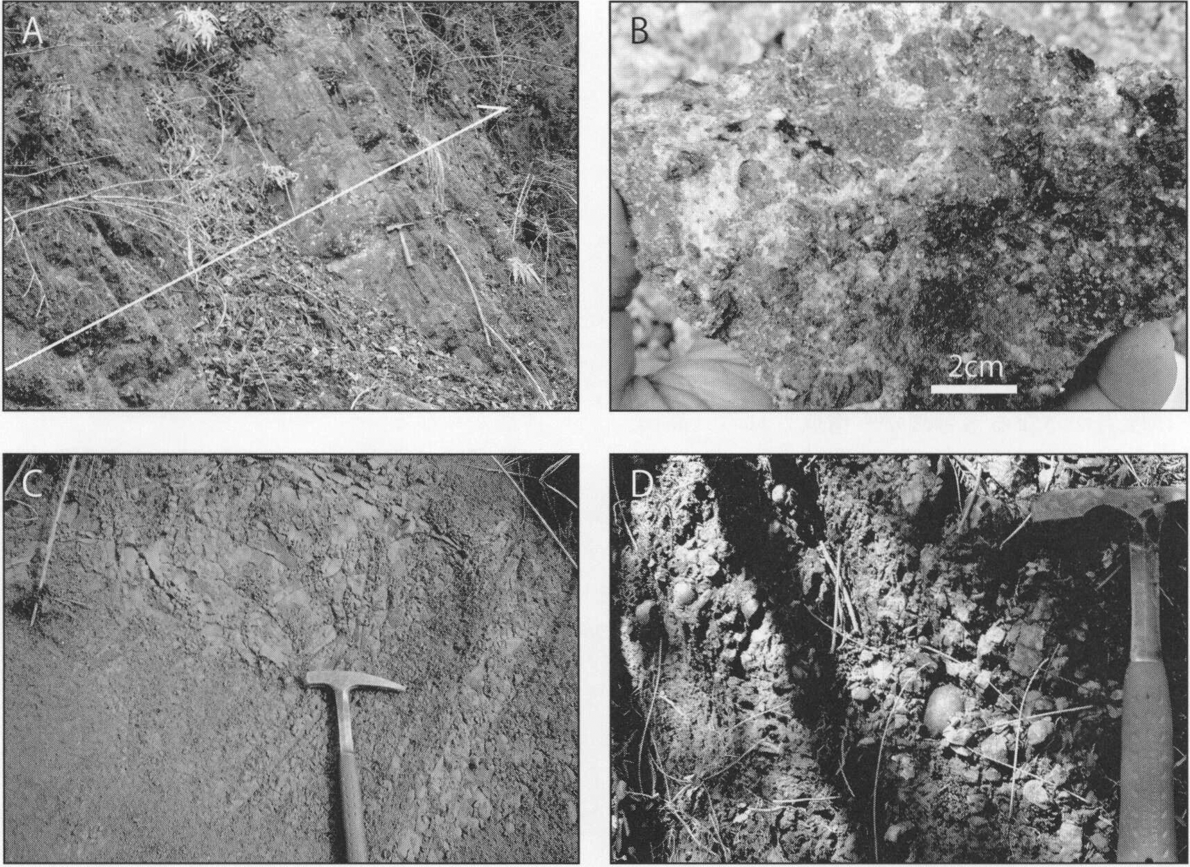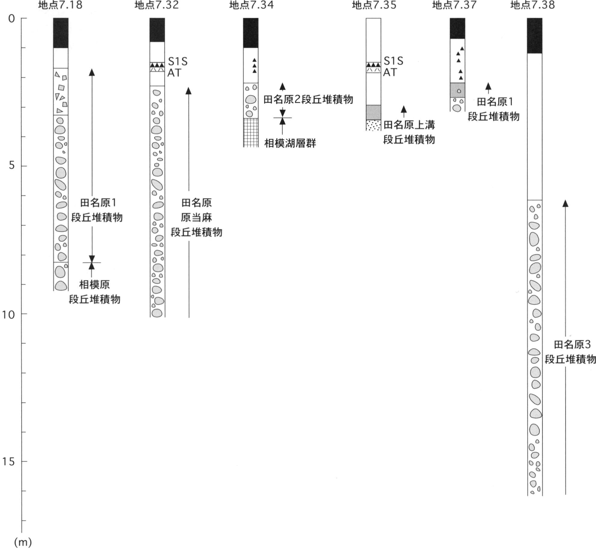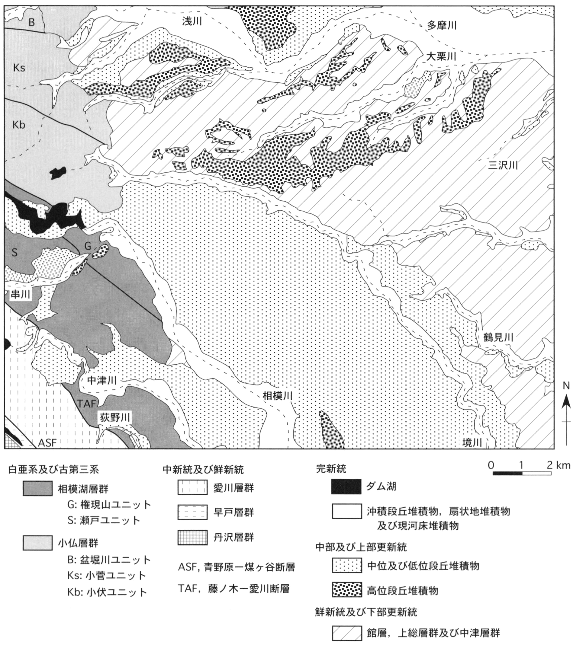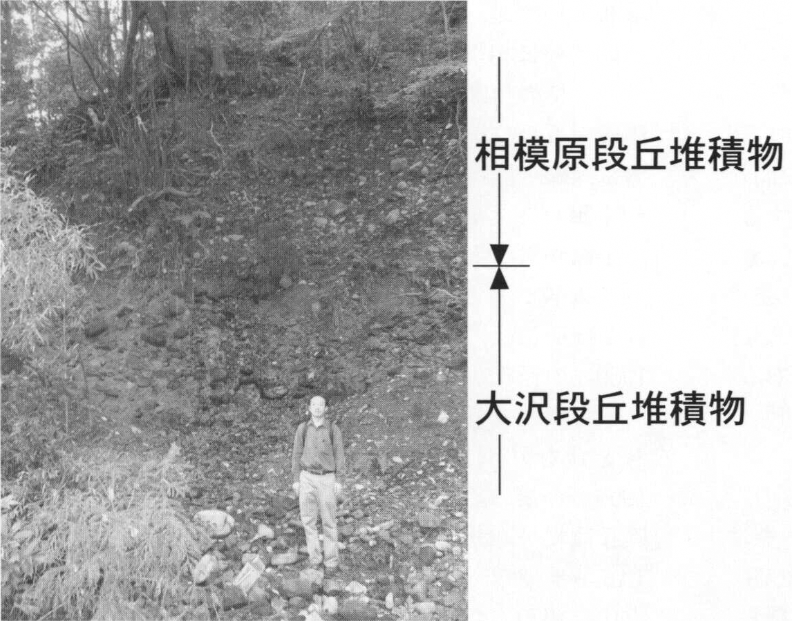 四万十帯白亜系小仏層群と古第三系相模湖層群,上総層群,立川2段丘堆積物を不整合に覆う.ローム層には覆われず,腐植土層のみに覆われる.