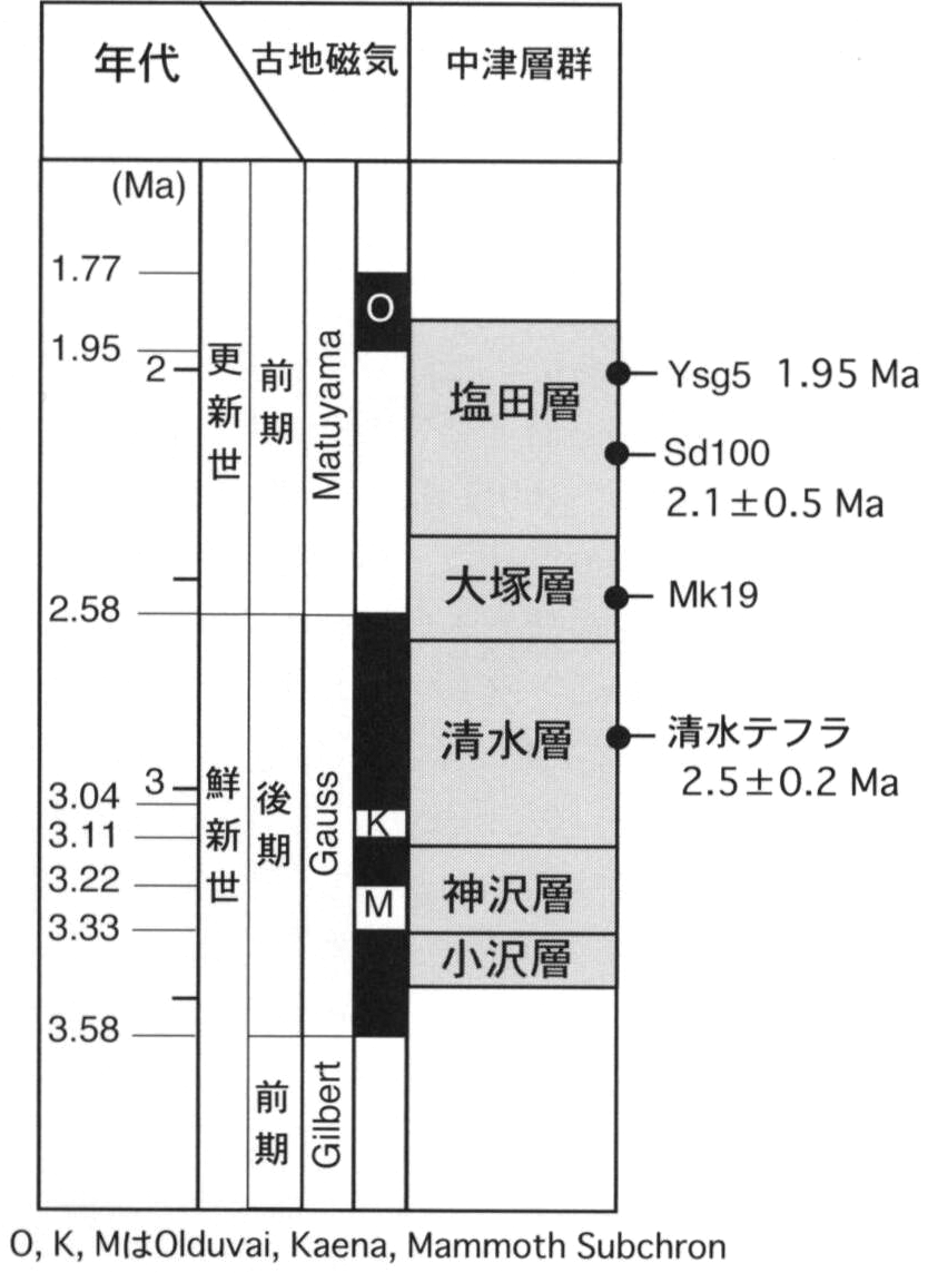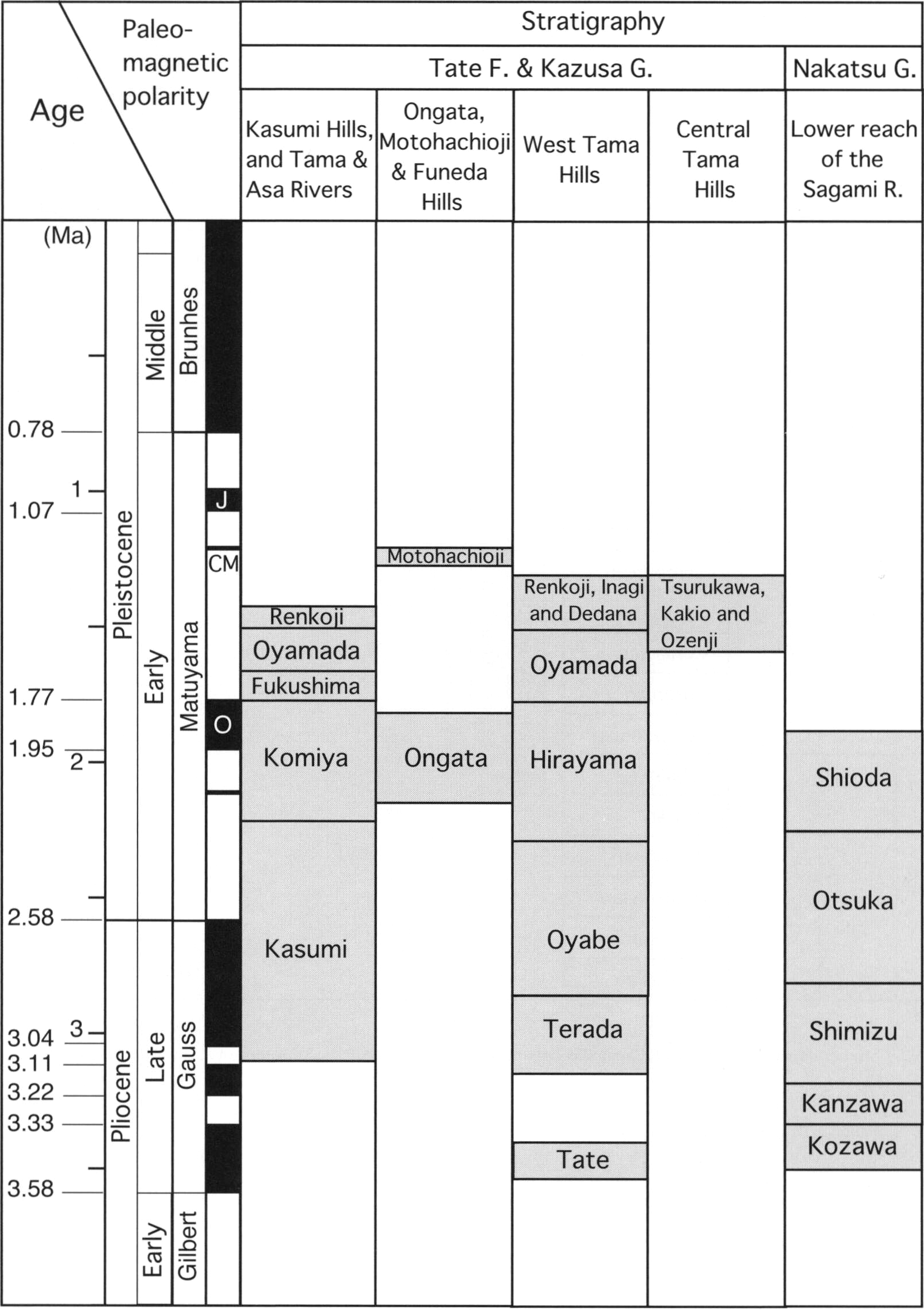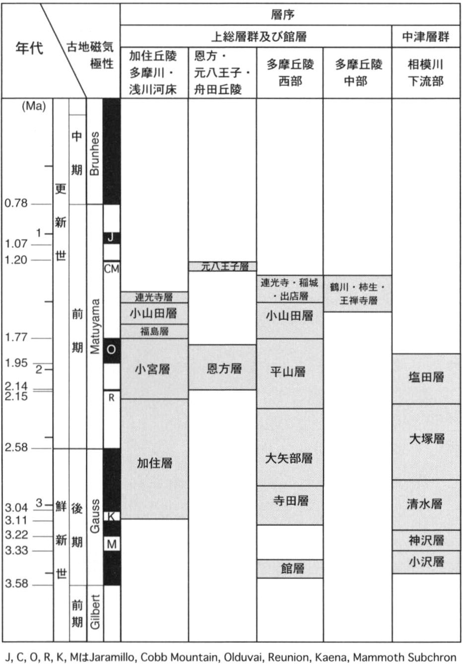 The Fukushima, Oyamada and Renkoji Formations along the Tama River are found in the Ome District. The ages of paleo-magnetic polarity boundary are referred to Cande and Kent (1995)