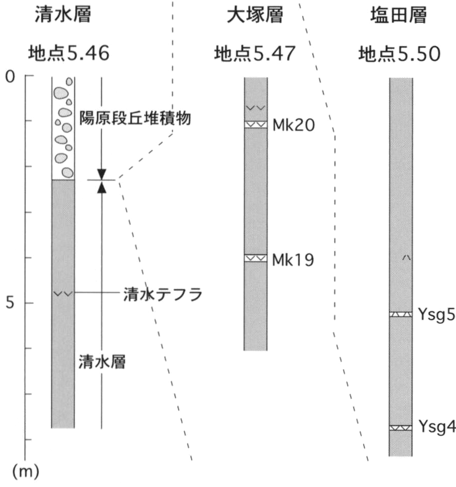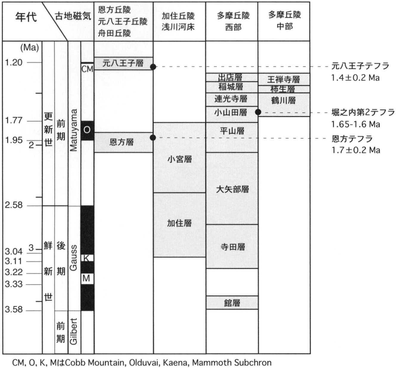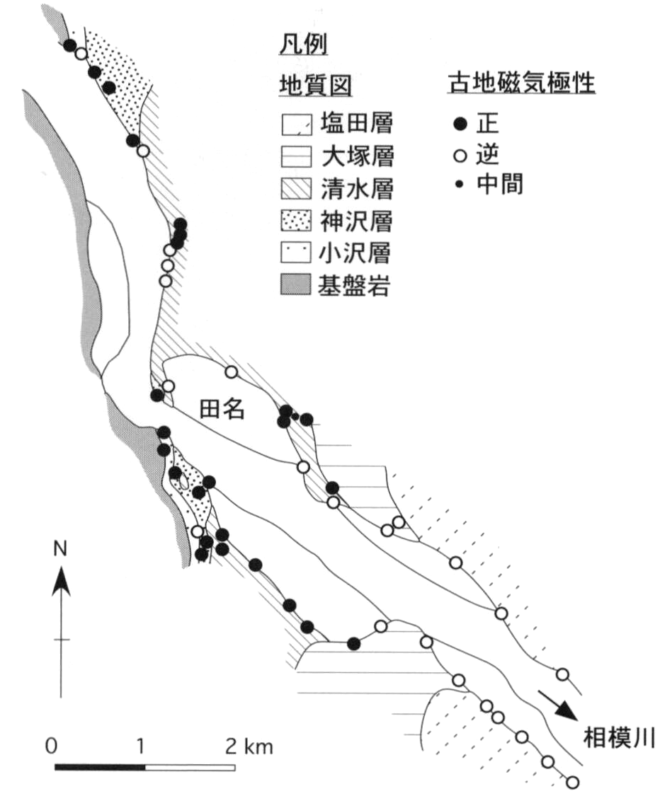 The Fukushima, Oyamada and Renkoji Formations along the Tama River are found in the Ome District. The ages of paleo-magnetic polarity boundary are referred to Cande and Kent (1995)
