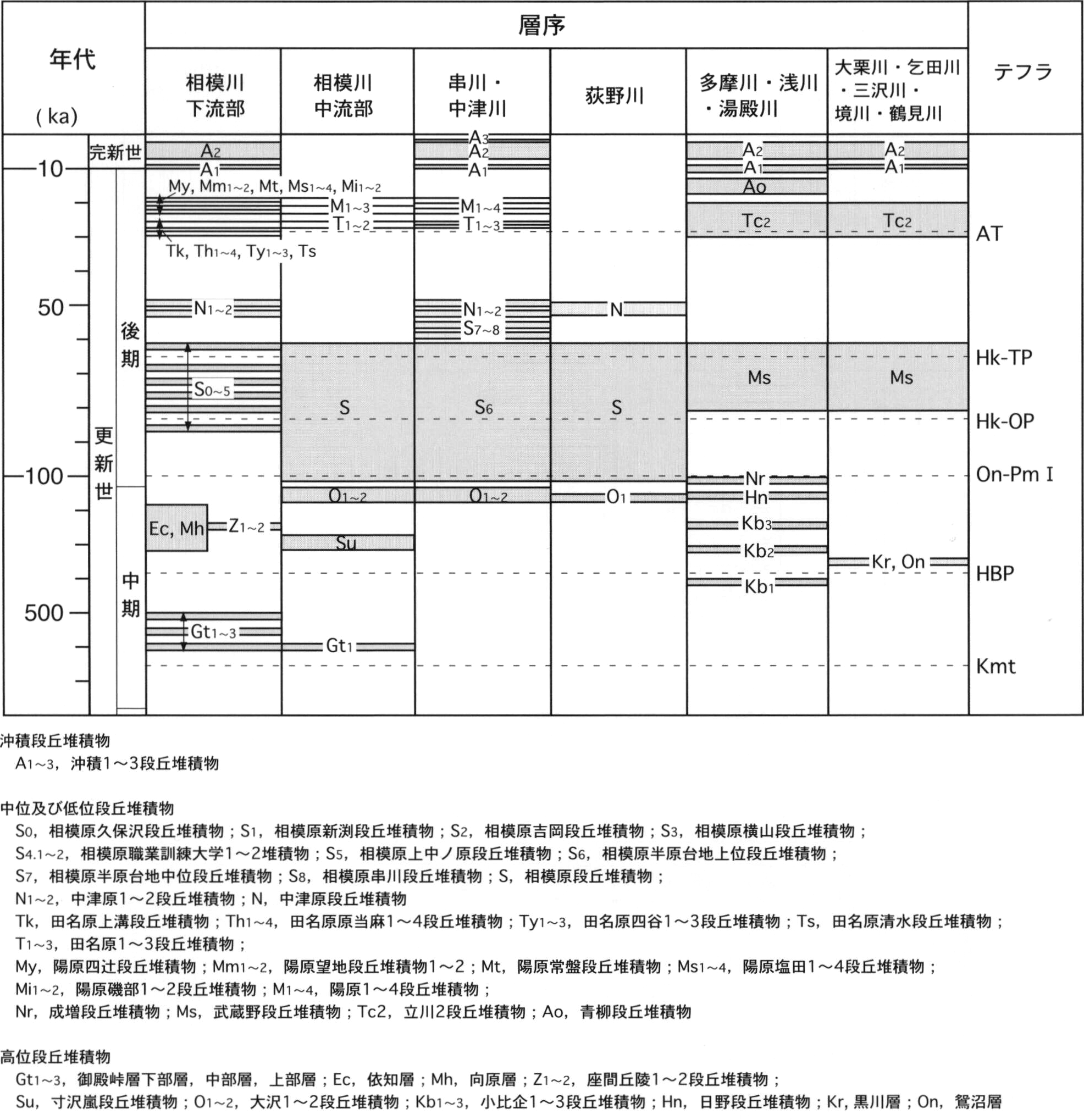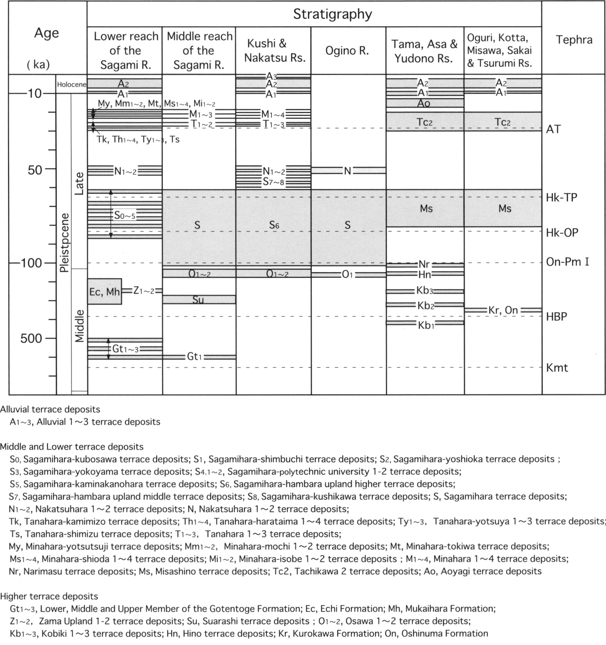 Middle Pleistocene to Holocene fluvial terrace deposits occur in parts of the hills and in all the uplands. Middle Pleistocene higher terrace deposits of the Gotentoge, Zama Hills, and Kobiki terrace deposits crop out in the west Tama, Zama and Kobiki Hills. The Echi and Mukaihara Formations bury valleys under the Sagamino and Nakatsuhara Uplands. Late Pleistocene middle and lower terrace deposits develop strath terraces over the Sagamino and Nakatsuhara Uplands in the lower reach of the Sagami River, while fill-top and fill-strath terraces along the middle reach of Sagami, Kushi and Nakatsu Rivers. Holocene alluvial terrace deposits occur along all streams, and modern alluvial fan and riverbed deposits are found in the trunk streams of the Sagami and Tama Rivers. Thick tephric loess called the "Kantō Loam" is intercalated by numerous tephra layers, and overlies all Middle and Late Pleistocene terrace deposits.