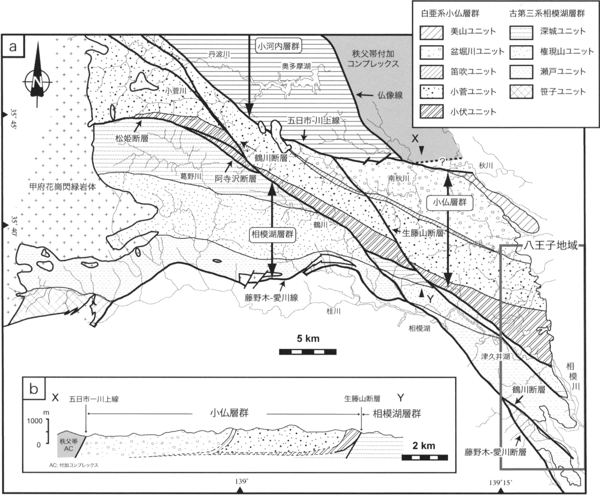 a, 地質概略図.神奈川県教育委員会(1980),酒井(1987, 2007),Yagi(2000)による.b, 断面図.Hara and Kurihara(2010)を改編.