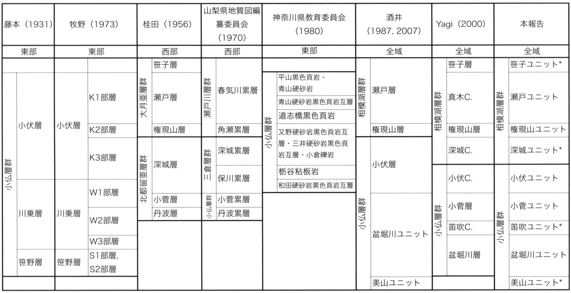 なお,酒井(2007)では,北隣の青梅地域において,ユニットをまとめる高次の単元に対し「コンプレックス」を与えた.このコンプレックスは,従来の研究の「層群」に相当する.関東山地の四万十帯付加コンプレックスは,大滝層群(藤本ほか,1950),小河内層群(藤本,1949),小仏層群(鈴木,1888;藤本,1931),相模湖層群(酒井,1987)の4つの層群に区分され,地域間による地層名の違いや変更はたびたび行われてきているが,層群名に関しては,現在まで提唱時の名称が踏襲されている.そこで,本報告ではユニットより高次の単元に対し「コンプレックス」への置き換えは行わず,そのまま「層群」を用いる.