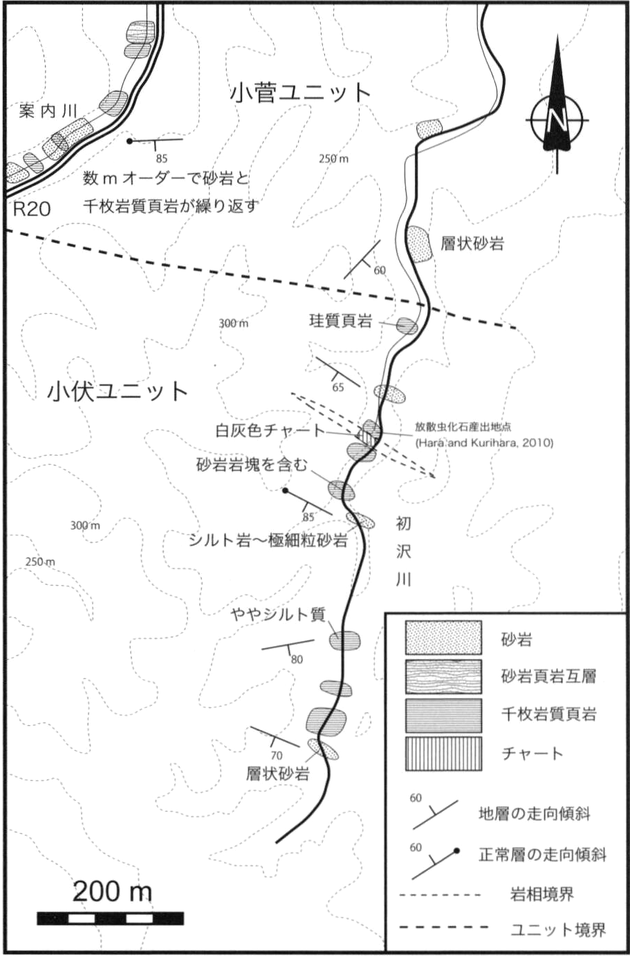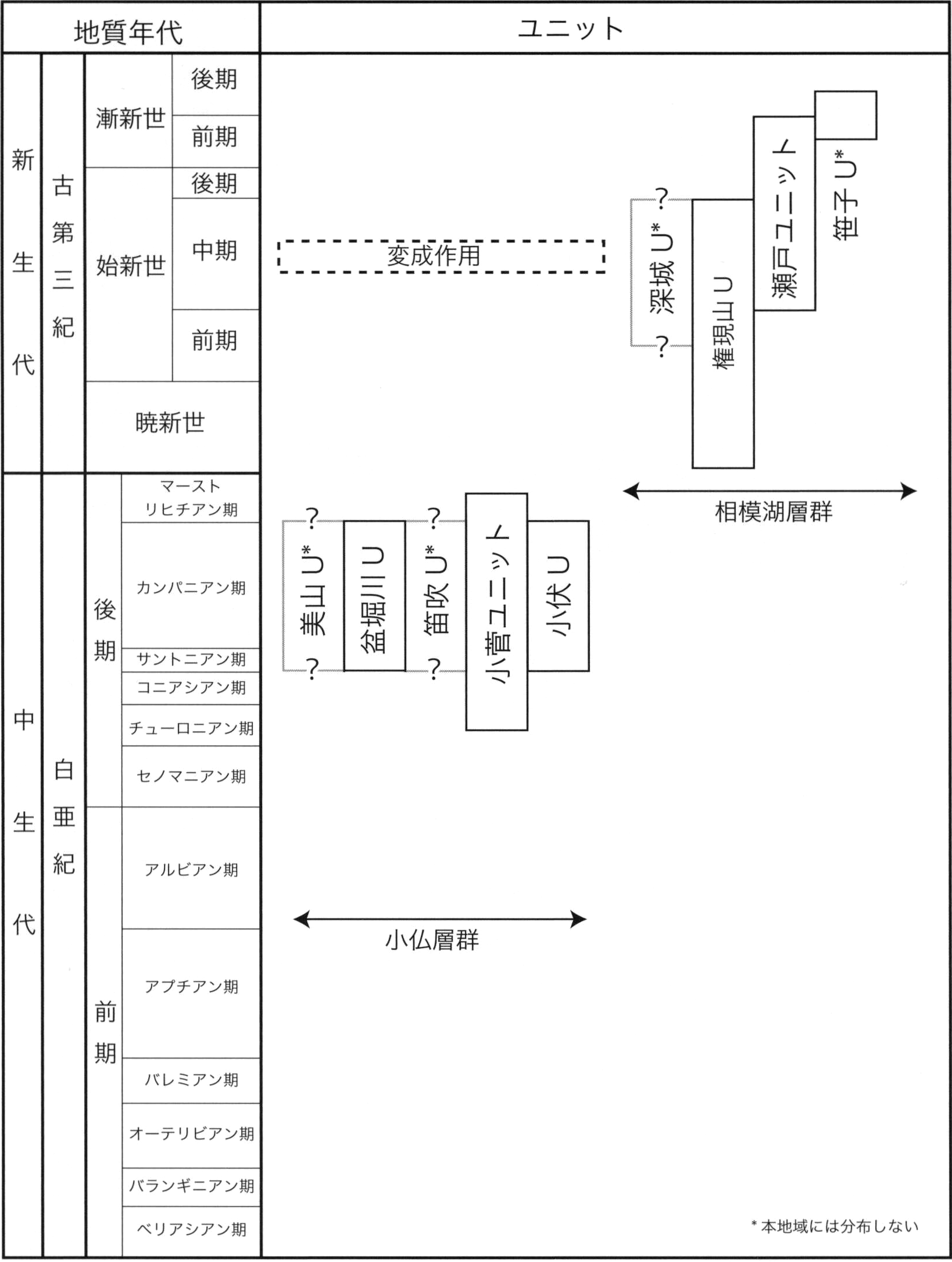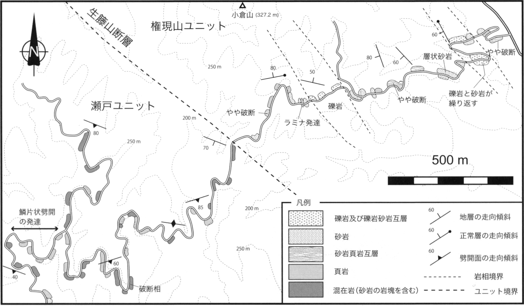 一般に付加コンプレックスでは,覆瓦構造を構成する逆断層によって挟まれ,類似する岩相を保持する一つのまとまりから,構造層序単元(tectono-stratigraphic unit)が認定される.従って,構造層序単元の境界は明瞭な逆断層であり,地質年代の違いも認められることが多い.本報告においても,岩相組合せの差異から構造層序単元を認定し,認定された構造層序単元の名称にはユニットを与えた.これは関東山地四万十帯付加コンプレックスにおける従来の研究の層序区分にほぼ相当することから,「層」を「ユニット」に置き換えることで研究結果との対比が可能である.ただし本報告では,四万十帯付加コンプレックス内のユニット境界をなす逆断層について,存在確実度不確定・位置精度不確定断層として扱う.これは,ユニット境界は岩相の相違により認定されている場合が多いこと,断層露頭の欠如により断層の運動方向が不明確であること,ユニット境界が高角度な姿勢を示しているため後のテクトニクスの影響を受けている可能性があることが理由であり,現在のユニット境界をなす断層の属性については不明な点が多いためである.