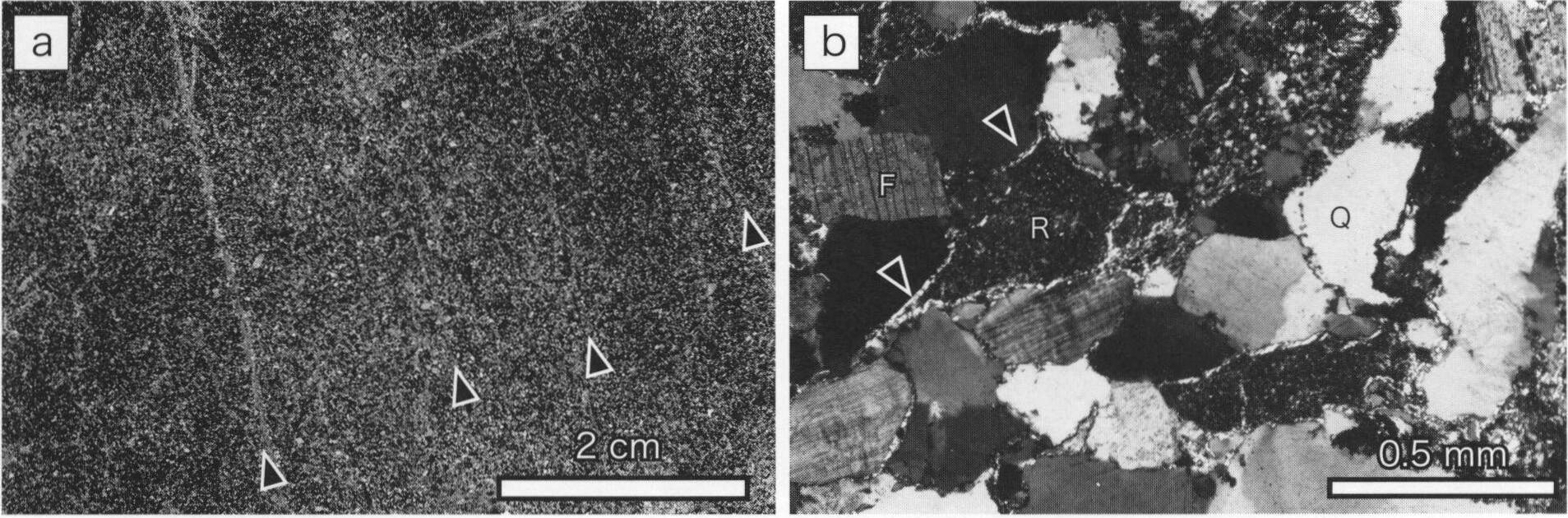 a, 塊状砂岩に発達する破断僻開.矢印は傍開を示す.蛇滝の北方約1.5kmの道路沿い. b, 薄片写真.クロスニコル.矢印は砕屑粒子周囲に生じた粘土鉱物を示す.Q:石英, F:長石, R:岩片.西隣上野原地域,小下沢下流の林道沿い.