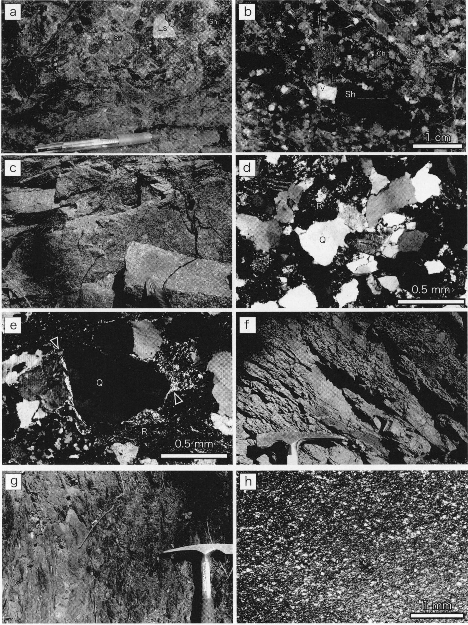 砂岩(Kss),砂岩頁岩互層(Ksi)からなり,ともに千枚岩質頁岩を狭在する.砂岩は,一般に細粒ないし中粒~粗粒で,灰色~灰緑色を呈し,層状ないし塊状である.砂岩には,破断劈開(fracture cleavage)が発達する(第3.4図a).破断劈開は,一般的に数cm間隔で認められ,層理面に対し高角度に斜交する.鏡下では砂岩粒子に沿って,圧力溶解劈開による黒色不透明なシーム,及び粘土鉱物の定向配列が観察される(第3.4図b).砂岩頁岩互層は,単層の厚さが10~50cmを示し,砂岩優勢ないし等量互層である.