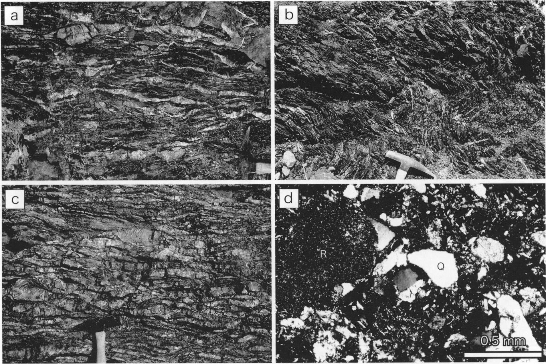 千枚岩質頁岩は,小伏ユニットに卓越して認められる.黒色を呈し,厚さ数mmのシルト岩を挟む.また,層理面に平行ないし斜交して片理面が発達する(第3.5図b).さらに,砂岩ないし凝灰質頁岩の岩塊及び岩片を伴い,それらが破断相ないし混在岩相を示すことがある(第3.5図c,d).鏡下においては,定向配列をなす粘土鉱物と黒色不透明なシームからなる圧力溶解劈開が認められ,これらが片理面を構成する.シルト大(径50μm以下)の石英・長石粒子は,片理面に沿って引き延ばされている(第3.5図e).