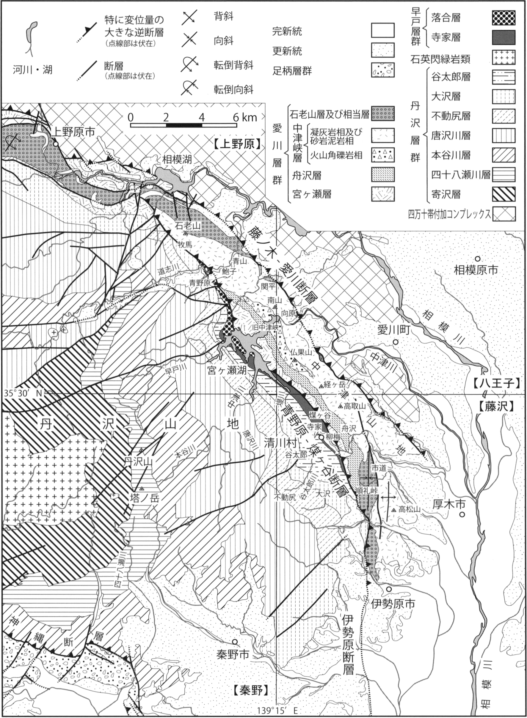 篠木・見上(1954)は,南部フォッサマグナの北東縁と四万十帯の地層群の境界をなす高角~低角の逆断層の藤ノ木―舟沢線(小林,1943)を神奈川県愛川町まで延長し,藤ノ木―愛川線と命名した.本報告では,「線」ではなく,「断層」として,藤ノ木―愛川断層と呼ぶ.また,「藤ノ木」は「藤野木」と表記されることもあるが,本報告では篠木・見上(1954)に従って,「藤ノ木」を使用する.本断層は,山梨県の桂川沿いの桂川断層(花井,1927),相模原市緑区の相模湖周辺の扇山衝上断層(金子,1955)を含む.