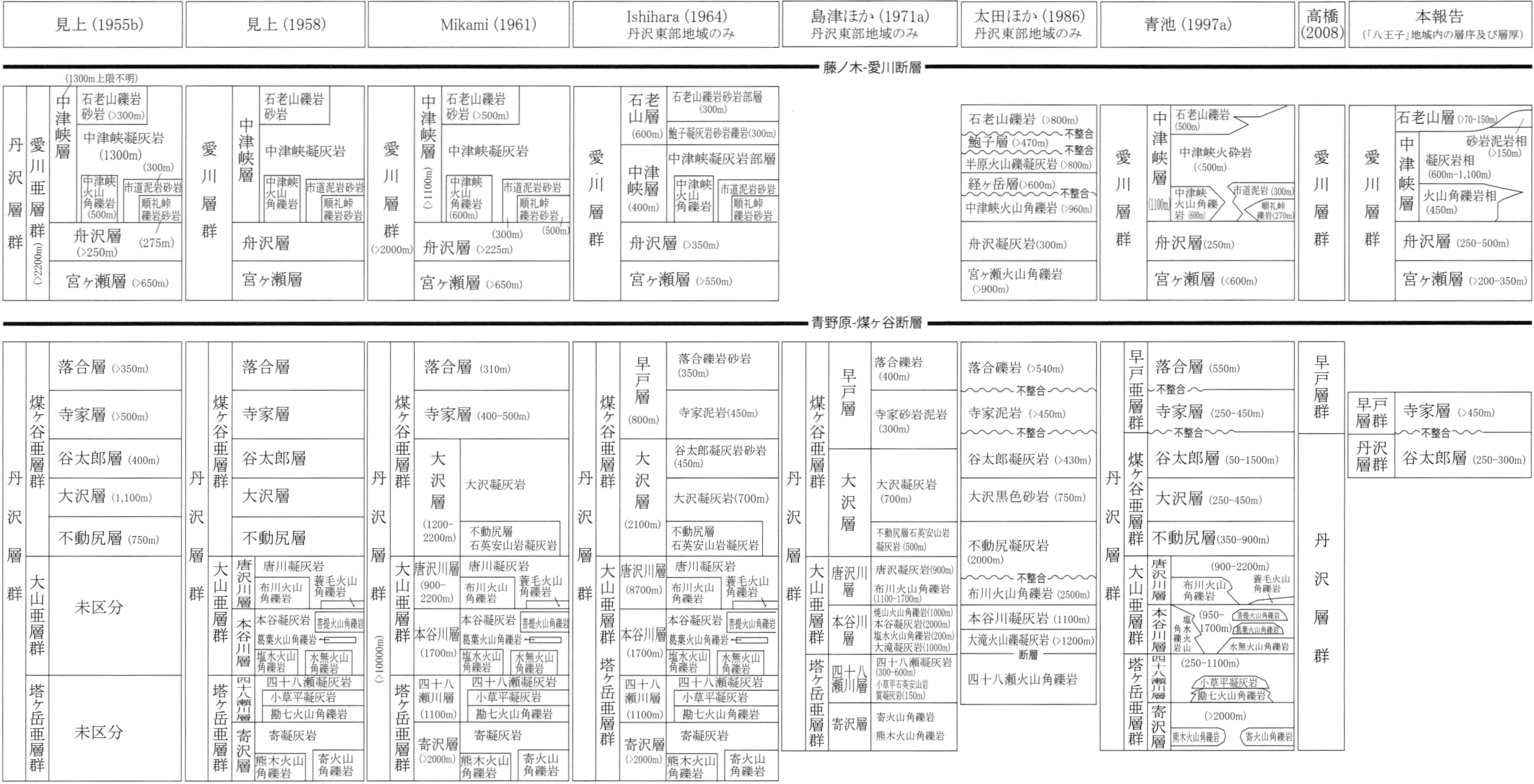 丹沢山地中部から東部には,火砕岩と堆積岩からなる中部~上部中新統の丹沢層群,堆積岩からなる上部中新統―鮮新統の早戸層群,火砕岩と堆積岩からなる上部中新統の愛川層群が分布する(Mikami,1961,1962;青池,1997a;有馬ほか,1999;高橋,2008など).このうち,丹沢山地北東端に位置する八王子地域には,丹沢層群の最上部,早戸層群の下部,愛川層群が分布する.