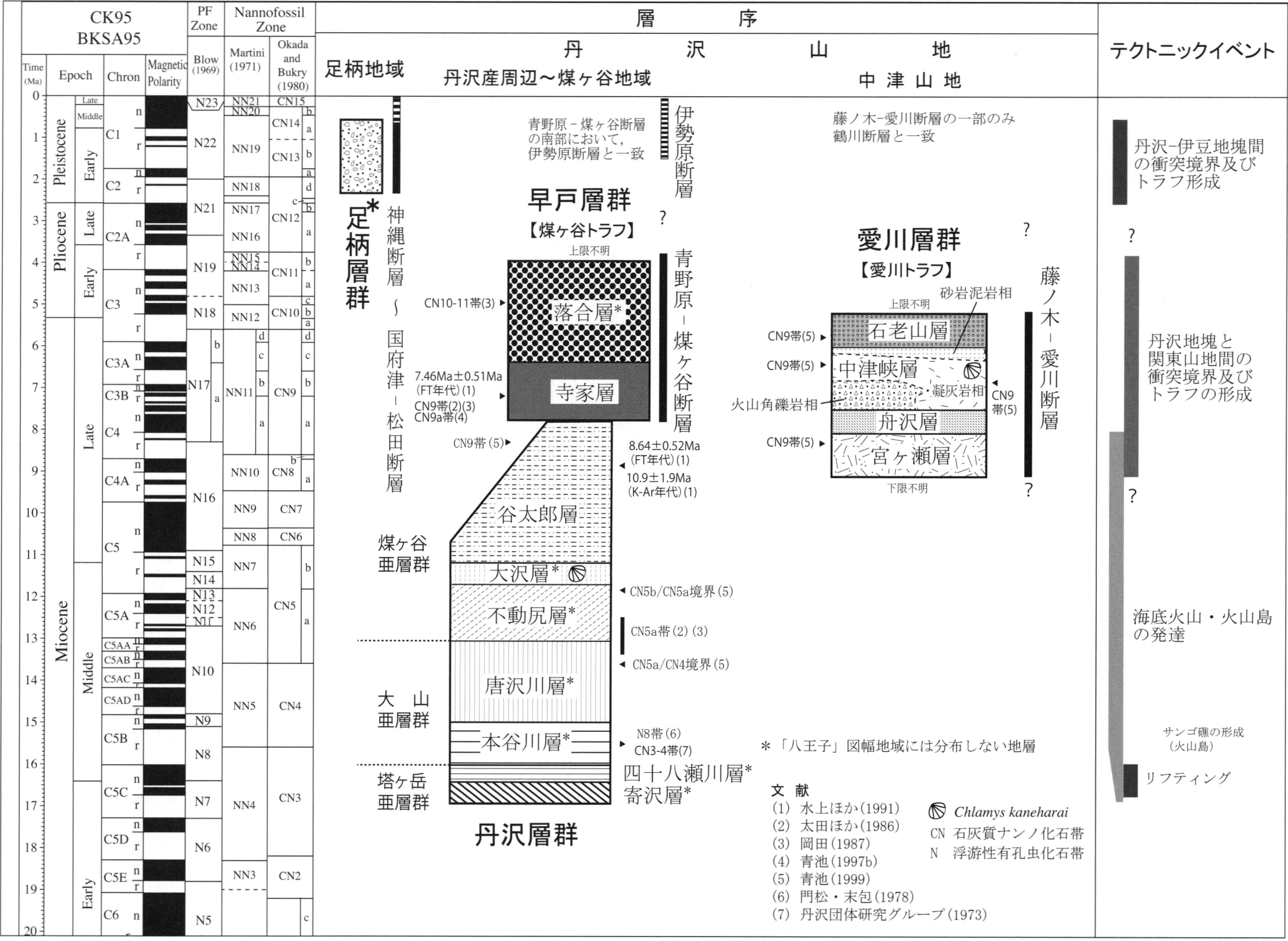 多摩川沿いの福島層,小山田層,連光寺層は青梅地域のみに分布する.古地磁気極性境界の年代はCande and Kent (1995) による.