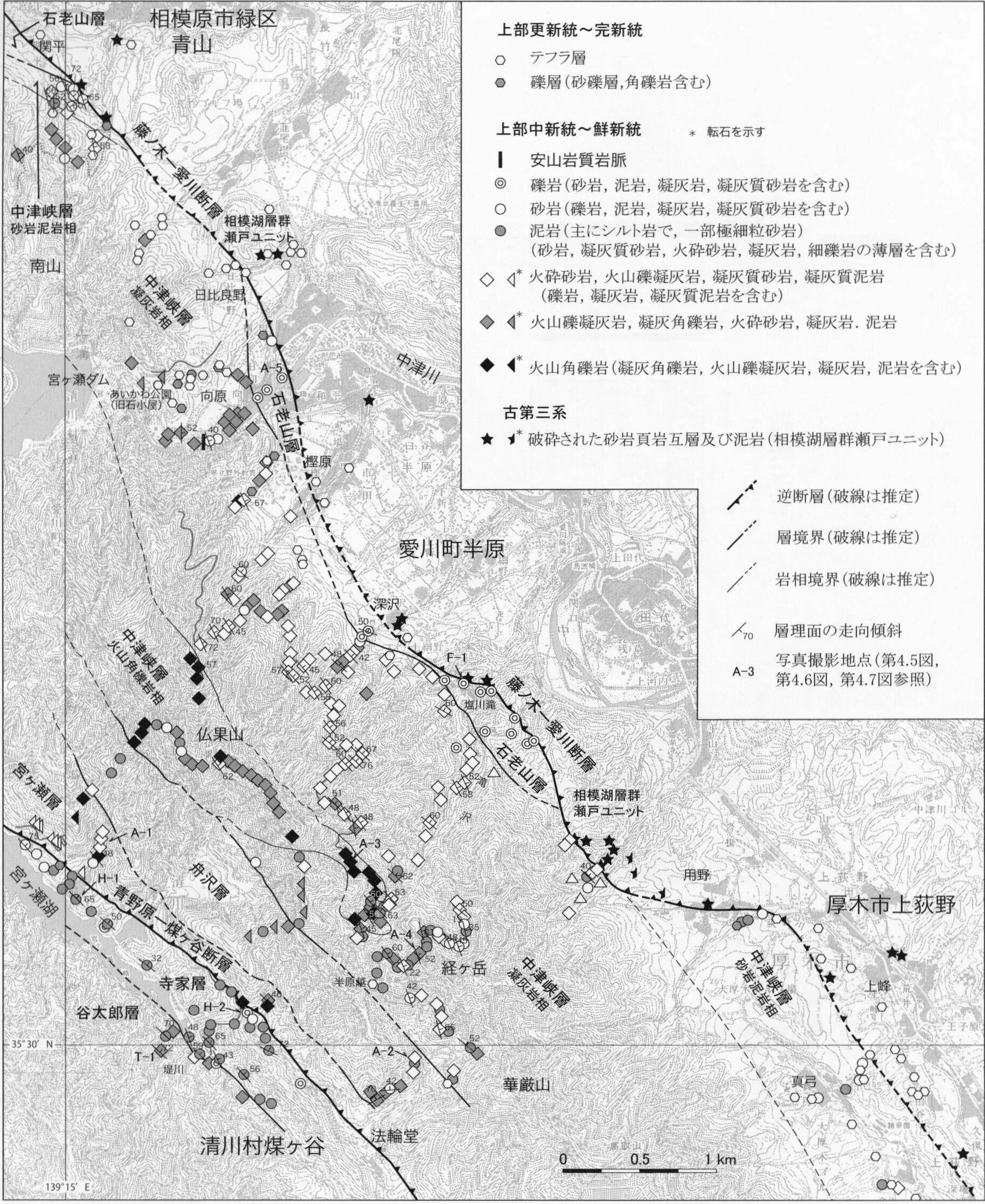 篠木・見上(1954)は,上野原地域の相模市緑区牧馬から宮ヶ瀬湖,清川村煤ヶ谷柳梅まで延び,愛川層群と早戸層群の境界をなす断層を,青野原―煤ヶ谷線と命名した.本報告では,「線」ではなく,「断層」として,青野原―煤ヶ谷断層と呼ぶ.本断層は活断層の伊勢原断層に一致し,地質断層として更に南へ延びると推定される.断層面は北東傾斜で,断層の北東側の愛川層群は全体として早戸層群よりも年代が古いため(第4.3図),本断層は逆断層と推定されている(青池,1999).また,本断層の活動時期は,断層沿いのトラフに分布する早戸層群の堆積中から堆積後と推定されている(青池,1999;高橋,2008など).
