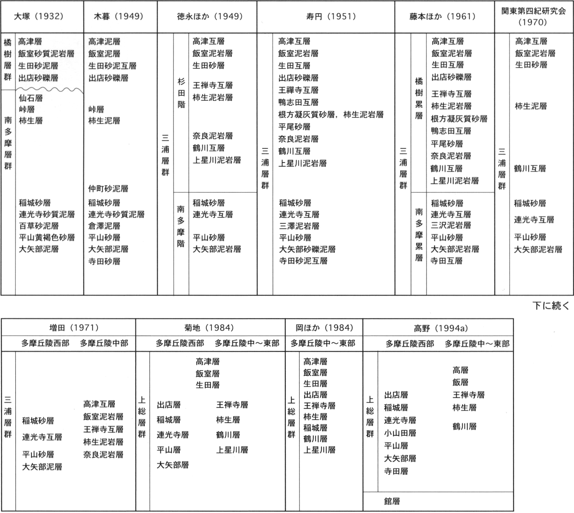 相模野台地,中津原台地では,神奈川県(1971),神奈川県建築士会(1972),岡ほか(1977,1979),藤野(1983a),諏訪(1983),厚木市秘書部市史編さん室(1985),相模原地形・地質調査会(1985,1986),海老名市教育委員会(1988),岡(1991),杉本ほか(1993),杉本(1995),美濃輪・杉本(1996),金井(1999)などの報告がある.これらには多数のボーリング柱状図が示され,依知層,向原層,段丘堆積物の地質断面図が描かれている.