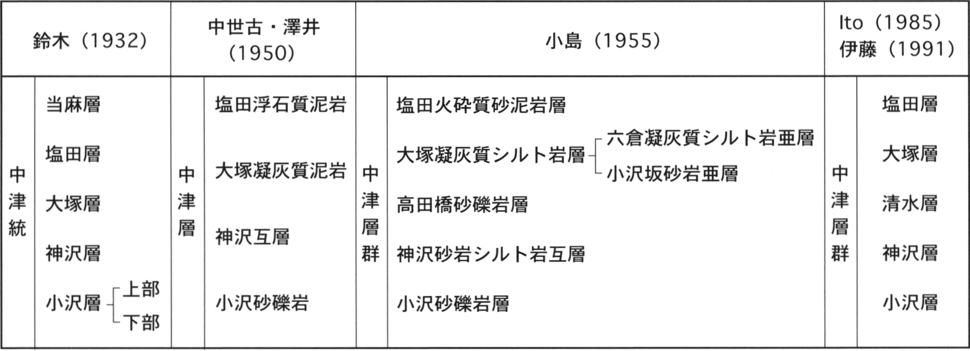 藤本(1931)及び牧野(1973)の川乗層のW1部層とW2部層の一部に,酒井(1987)の盆堀川層の一部に,Yagi(2000)の小菅層に相当する(第3.2図).