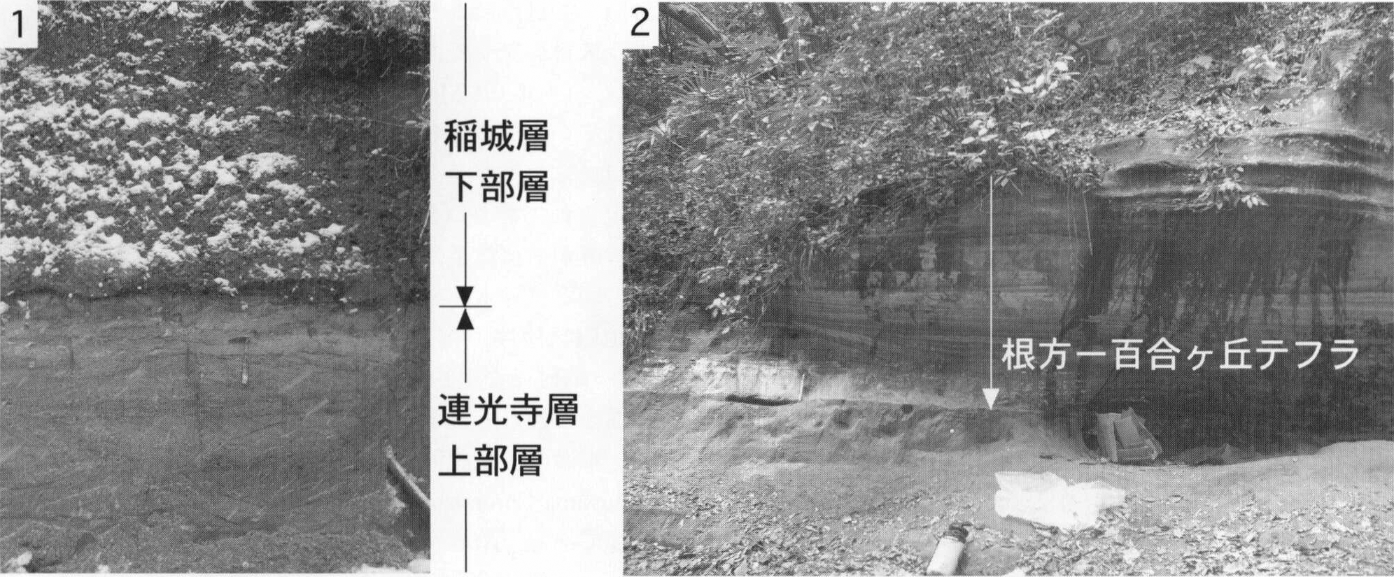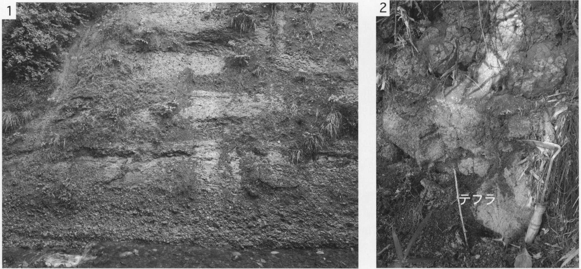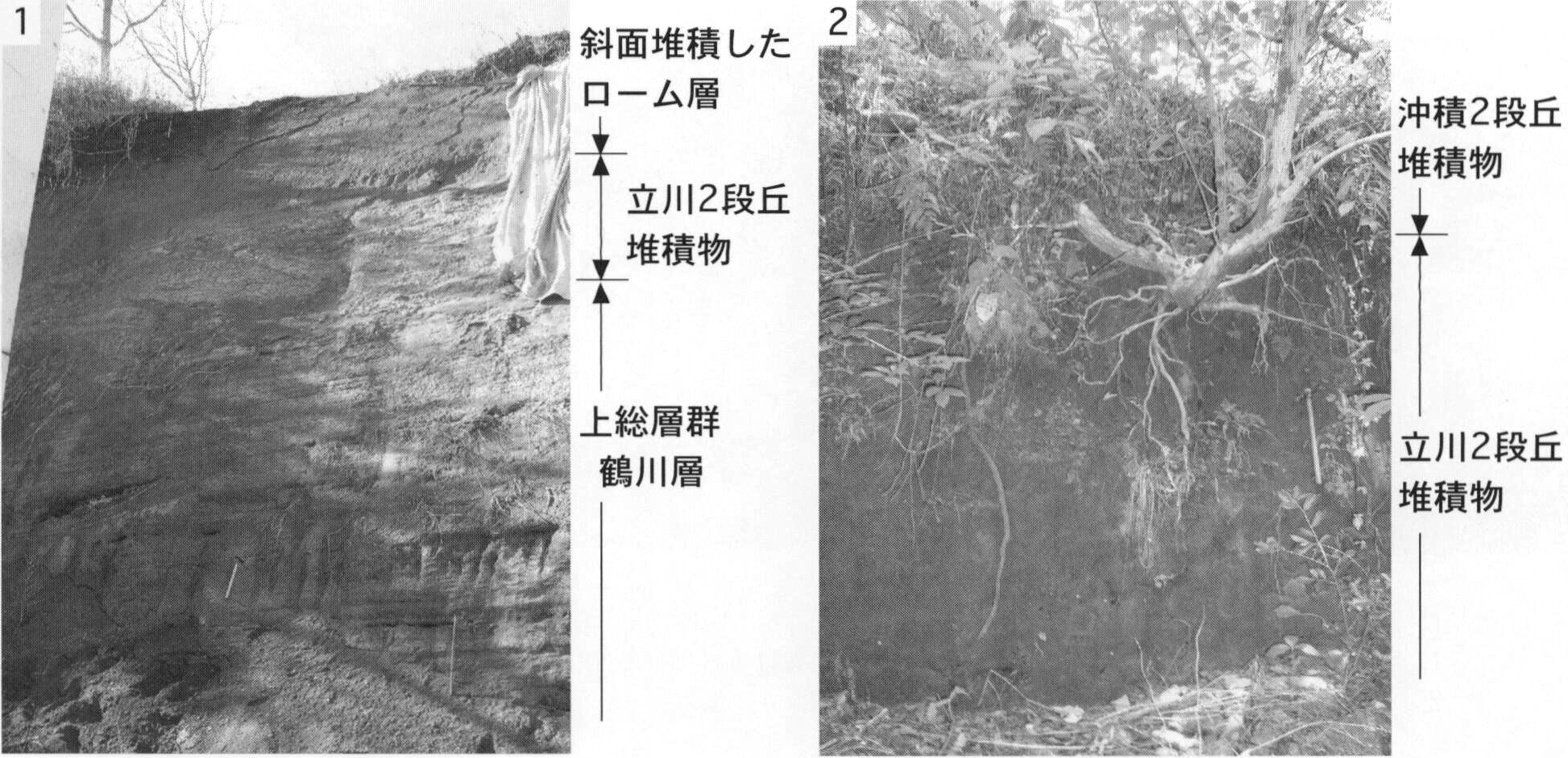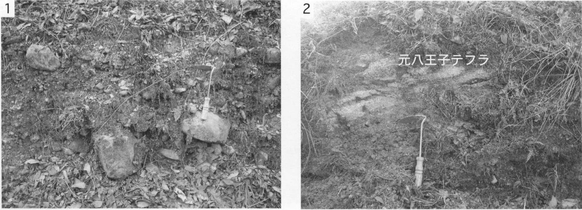 1.町田市上小山田町(地点8.4)における腐植質シルト層.現在はこの露頭は見られない. 2.八王子市堀之内(地点8.5)における材化石を含む腐植質シルト層.現在はこの露頭は見られない.