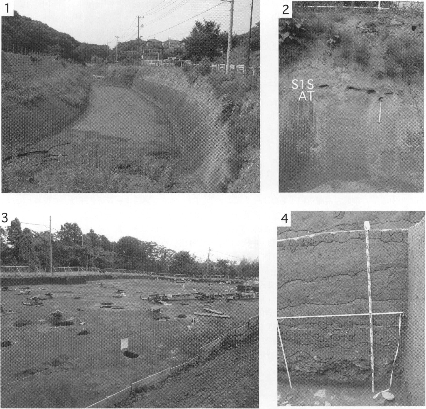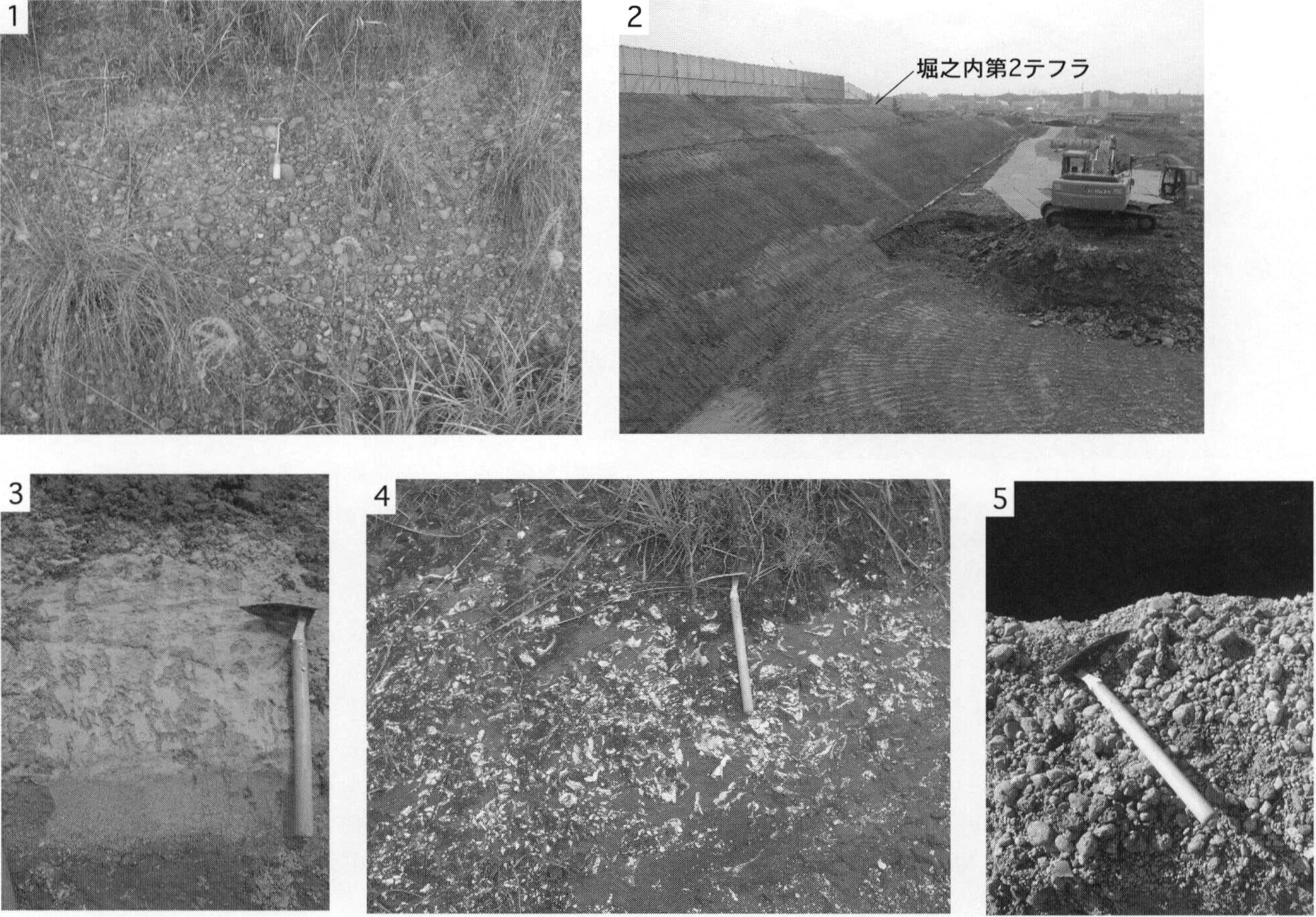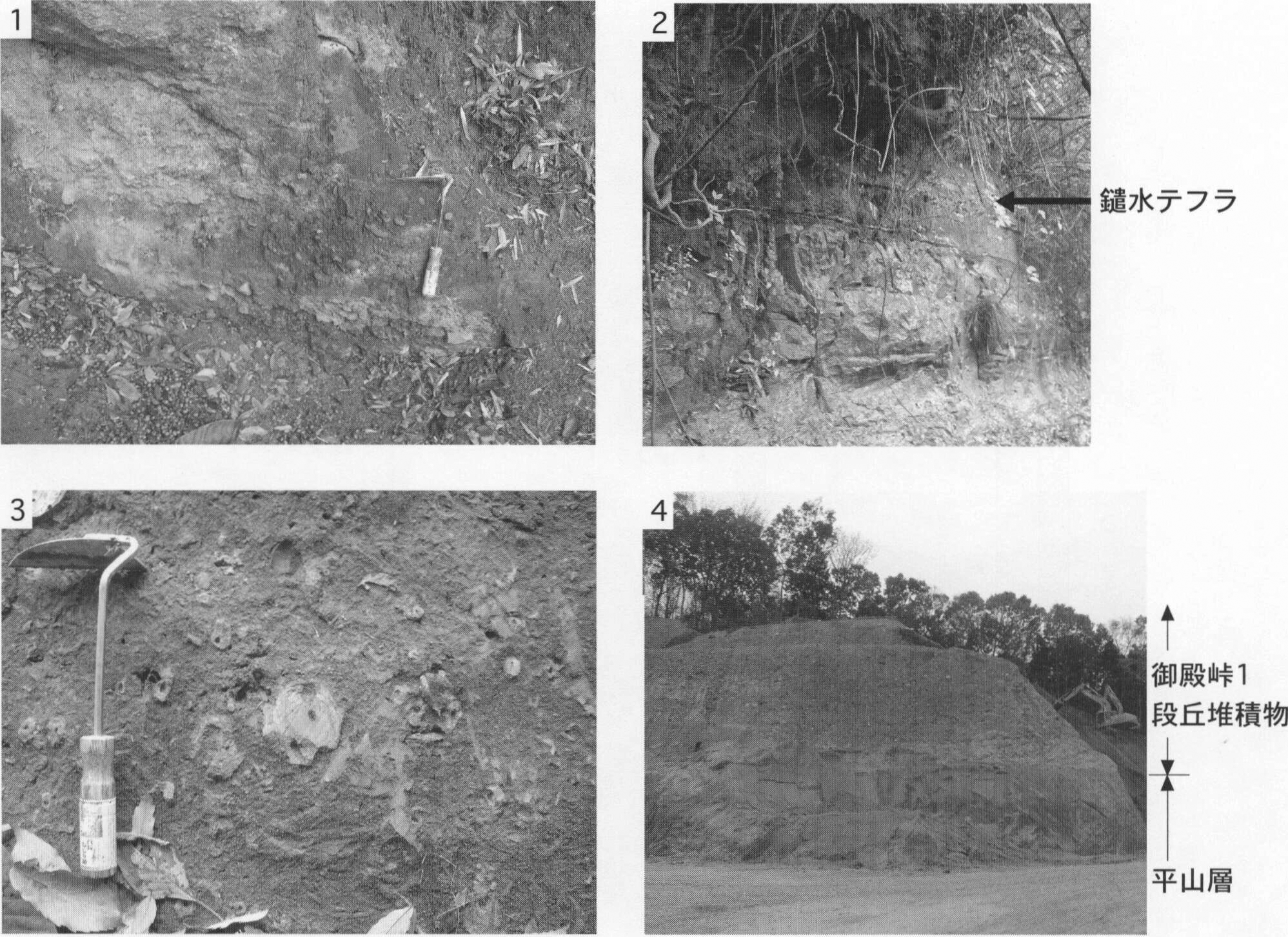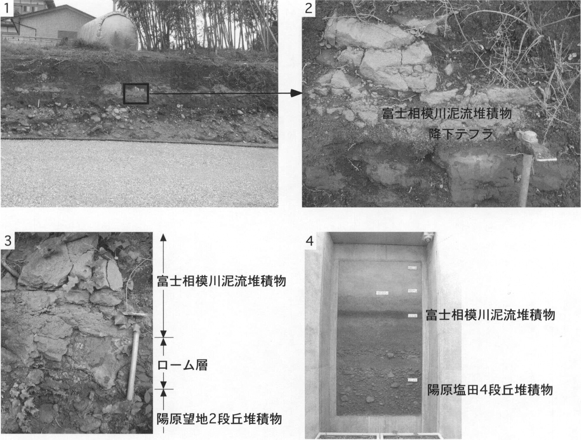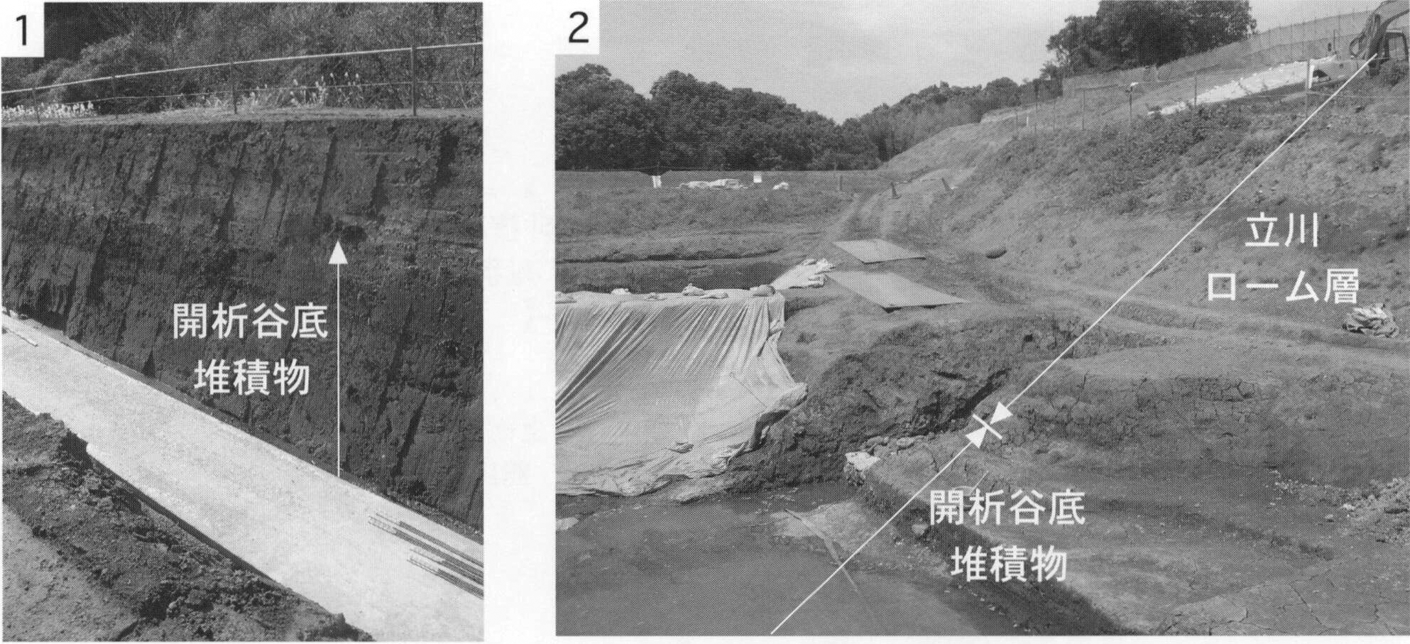 1.町田市上小山田町(地点8.4)における腐植質シルト層.現在はこの露頭は見られない. 2.八王子市堀之内(地点8.5)における材化石を含む腐植質シルト層.現在はこの露頭は見られない.