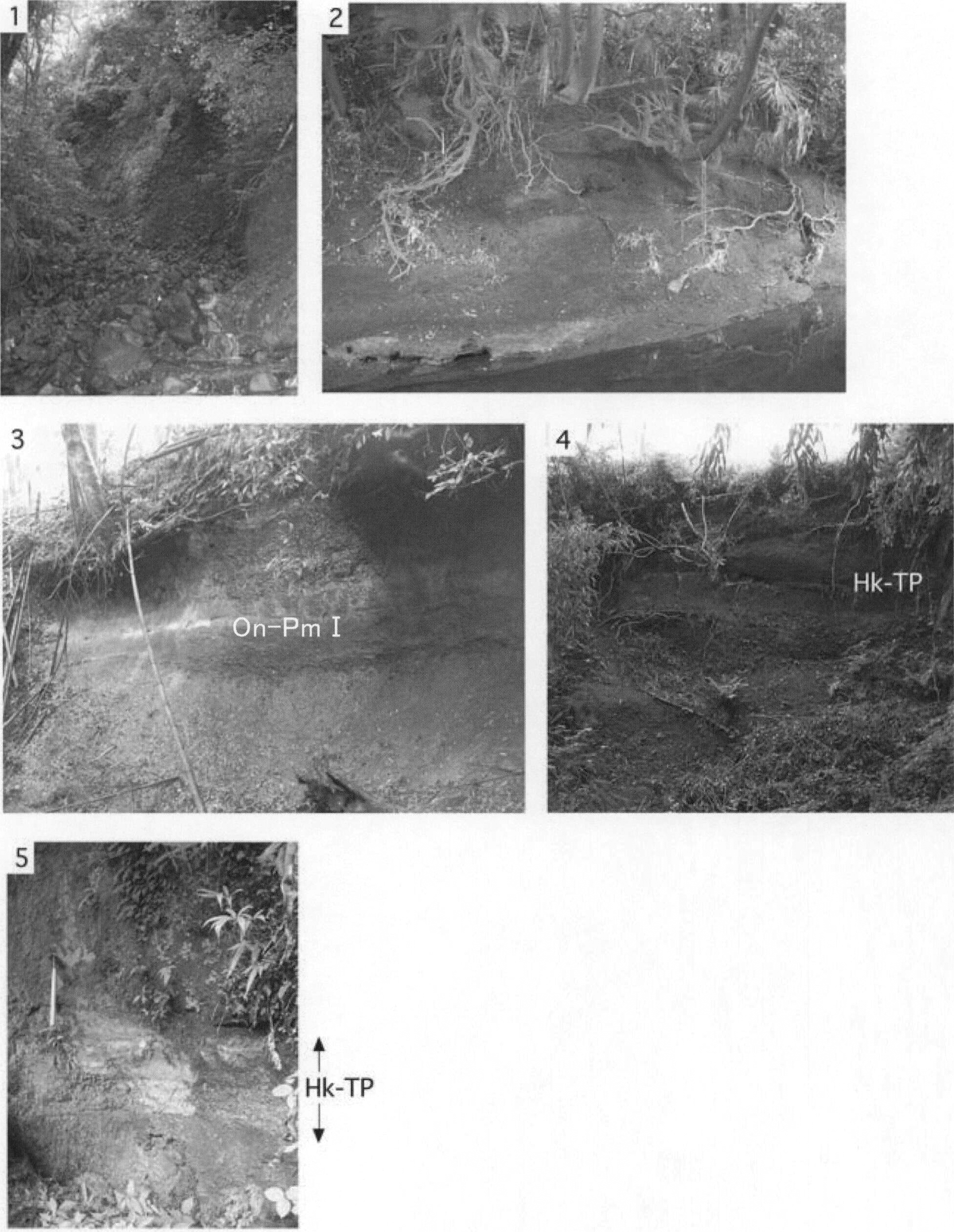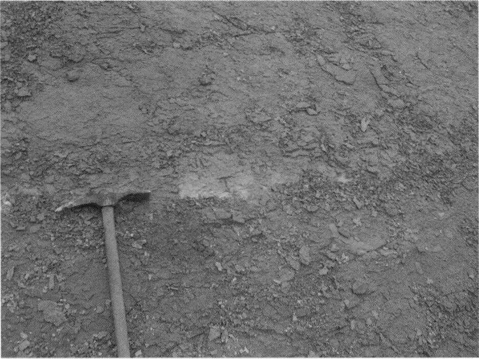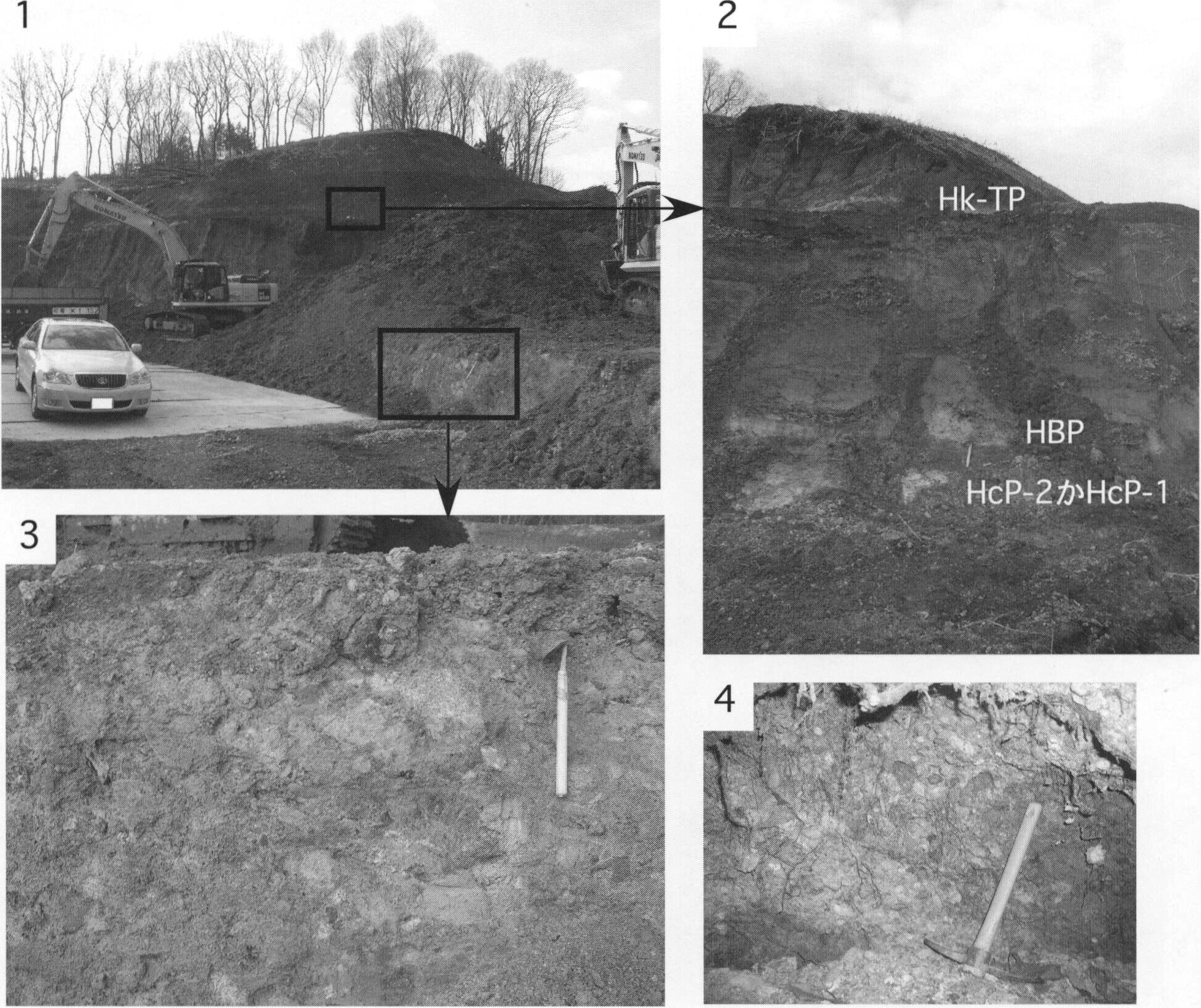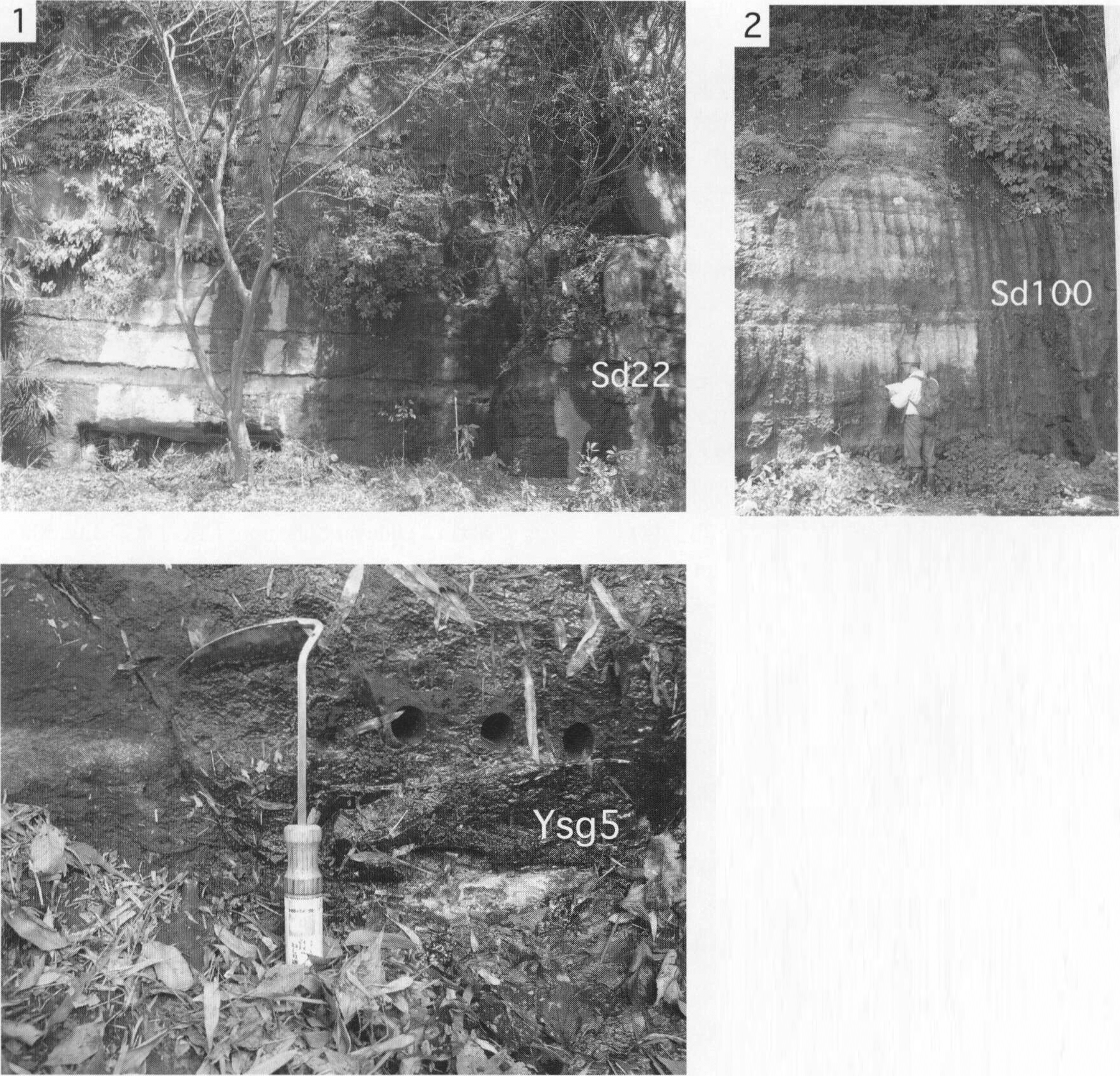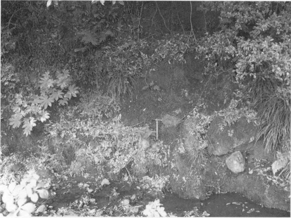 1.町田市上小山田町(地点8.4)における腐植質シルト層.現在はこの露頭は見られない. 2.八王子市堀之内(地点8.5)における材化石を含む腐植質シルト層.現在はこの露頭は見られない.