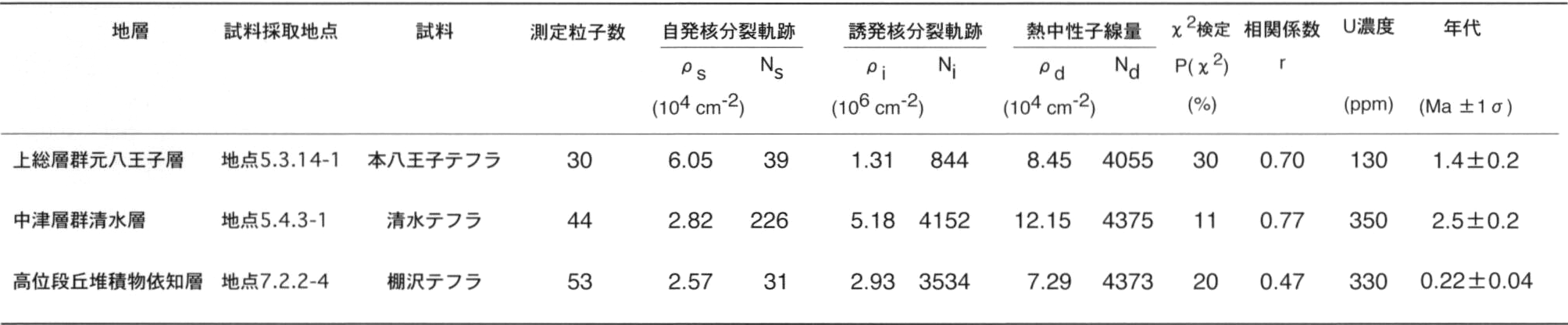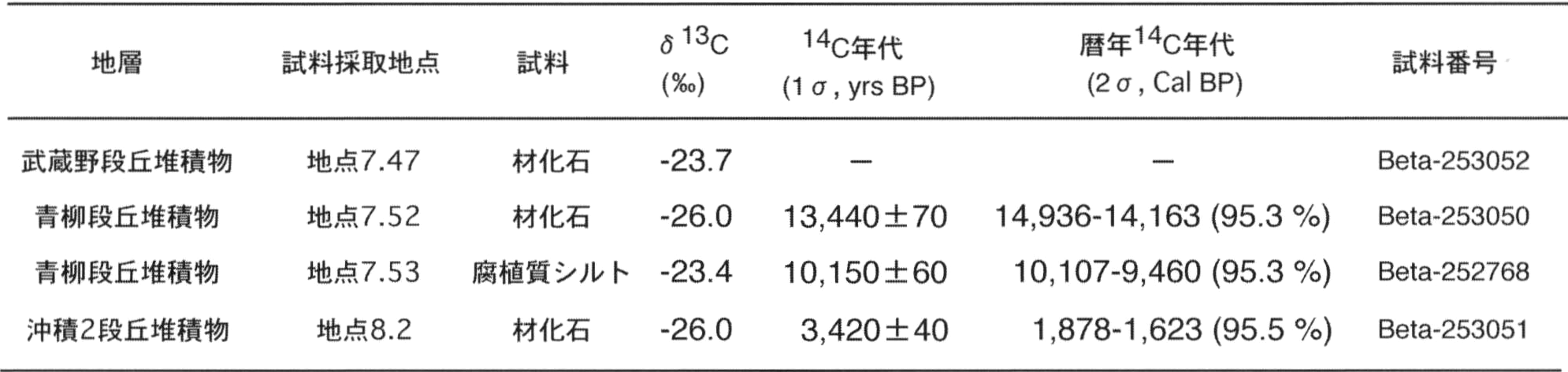 本堆積物の年代は不明であるが,今までに得られた年代から,完新世前期~後期とする.