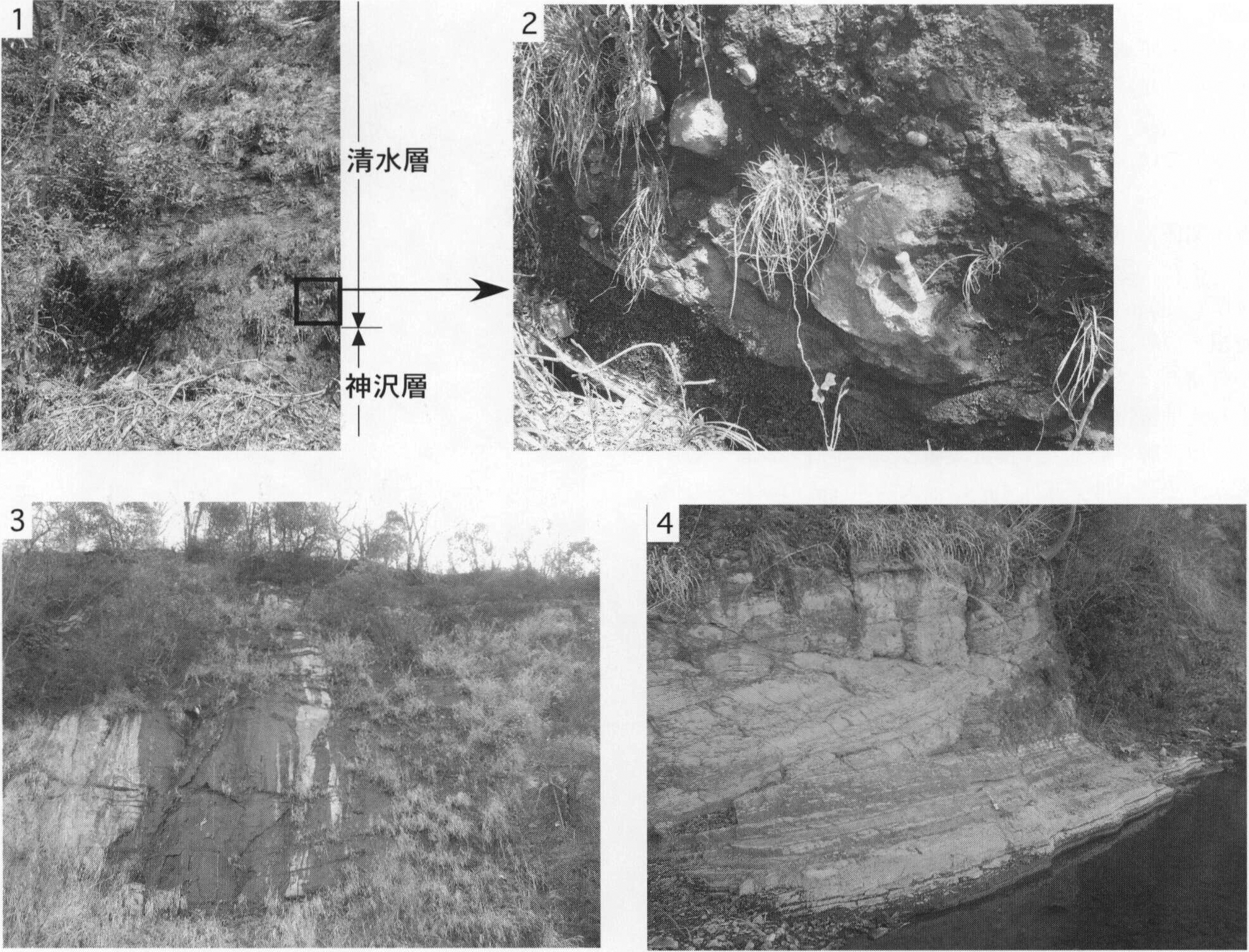 1.材化石を多量に含む円礫〜亜円礫層とシルト層.現在はこの露頭は見られない. 2.材化石の樹幹.