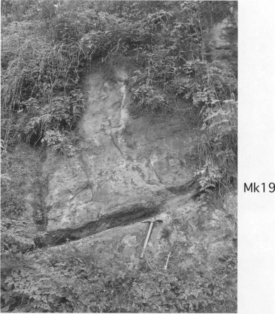 The Yataro Formation is composed of basalt to andesite lapilli tuff, tuffaceous sandstone, sandstone and mudstone, with thin beds of pumice tuff. The Zike Formation uncomformably overlies the Yataro Formation, and consists mainly of mudstone, accompanied by sandstone, tuff and conglomerate. The Aikawa Group includes the Miyagase, Funazawa, Nakatukyo and Sekirozan Formations. The Miyagase Formation is composed mainly of basalt to andesite volcanic breccia, with dacite tuff, sandstone and mudstone. The basal portion of the Miyagase Formation is in fault contact with the Zike Formation. The Funazawa Formation rests conformably on the Miyagase Formation and is composed mainly of basalt to andesite tuff and lapilli tuff, tuffaceous sandstone and mudstone, accompanied by dacite tuff. The Nakatukyo Formation rests conformably on the Funazawa Formation, and includes volcanic breccia, tuff, and sandstone and mudstone facies. The Sekirozan Formation rests uncomformably on the Nakatsukyo Formation, and is dominated by conglomerate of deep submarine fan channel origin. The Nakatukyo and Sekirozan Formations are in fault contact with the Sagamiko Group of the Shimanto belt.