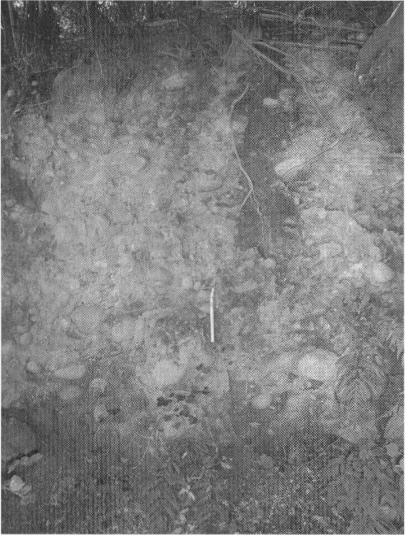 八王子地域では,本堆積物は露出が悪いため,詳細は不明である.本堆積物に相当する多摩川の天ヶ瀬層の層相は,武蔵野台地では植木(2007d)に概説されている.南浅川では,八王子市裏高尾町(地点7.51)で,立川2段丘堆積物の上位に層厚70cmの中礫~大礫サイズの亜円礫~亜角礫が観察される(第7.15図,第7.16図の2).大栗川では,本堆積物は層厚2~7mの砂礫層からなる(藁谷,1993a,b).境川では,相模原市緑区橋本(地点7.21)で,相模原段丘堆積物の上位に層厚20cmの粗粒砂層,層厚50cmの細礫~中礫サイズの亜角礫~角礫層,層厚30cmの細粒砂層が重なり,層厚120cmの腐植土層に覆われる(第7.9図).