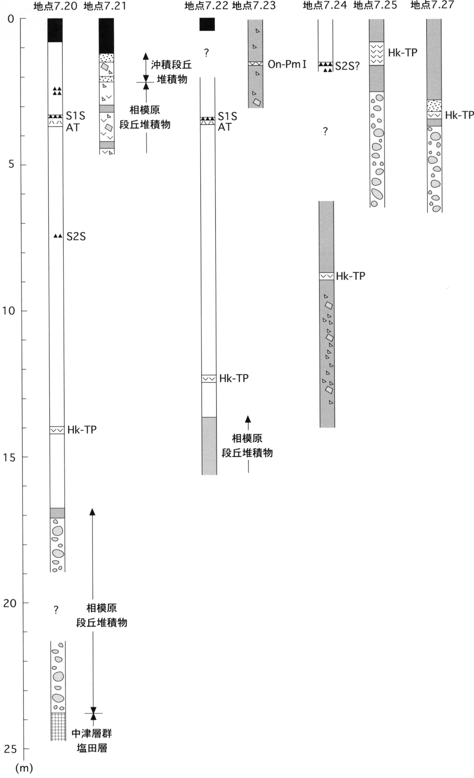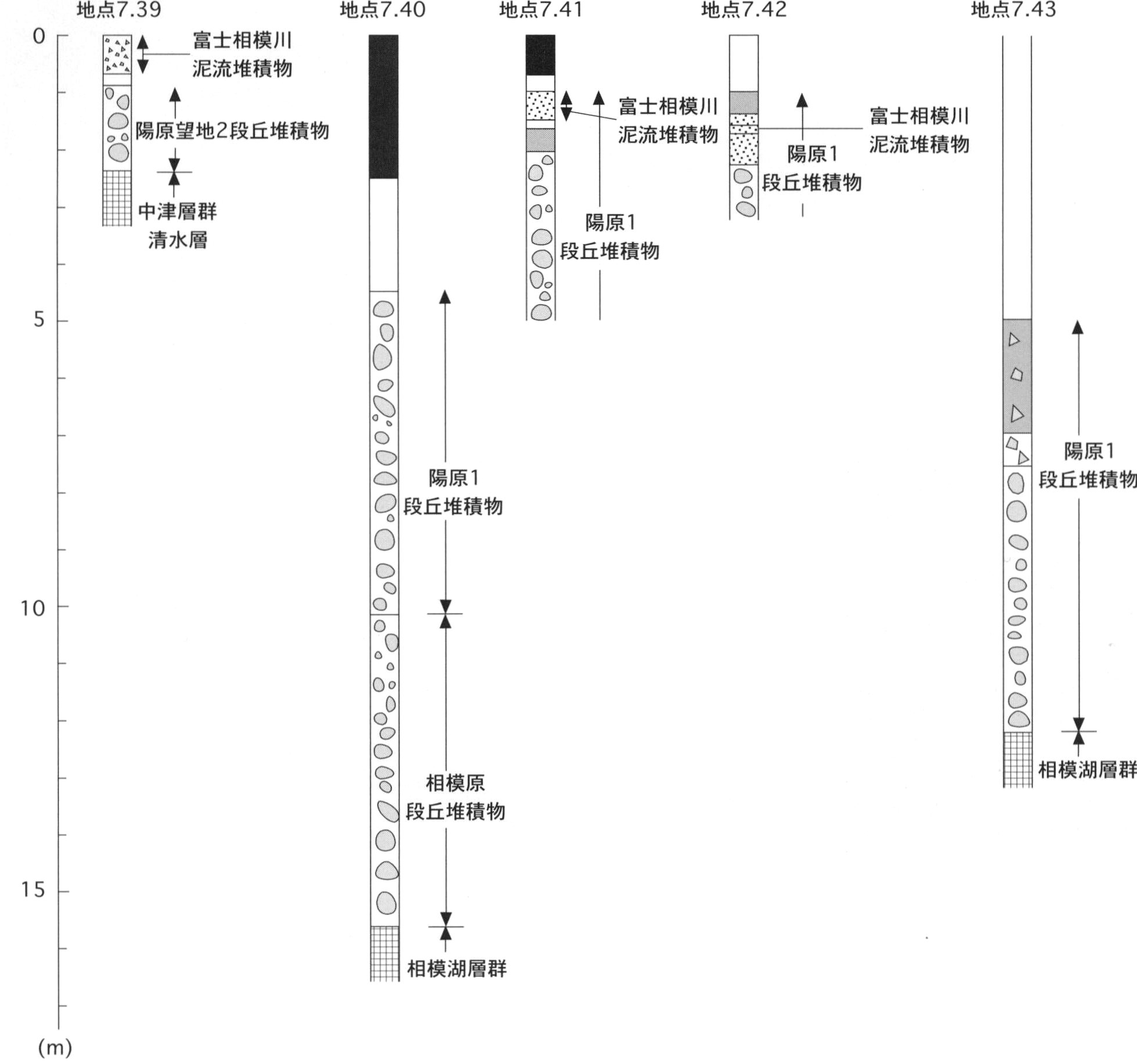 八王子地域では,本堆積物は露出が悪いため,詳細は不明である.相模川下流部では,相模原市緑区大島(地点8.1)で,中津層群神沢層の上位に層厚4mの巨礫サイズの円礫層からなる.ここでは,ローム層に覆われない.