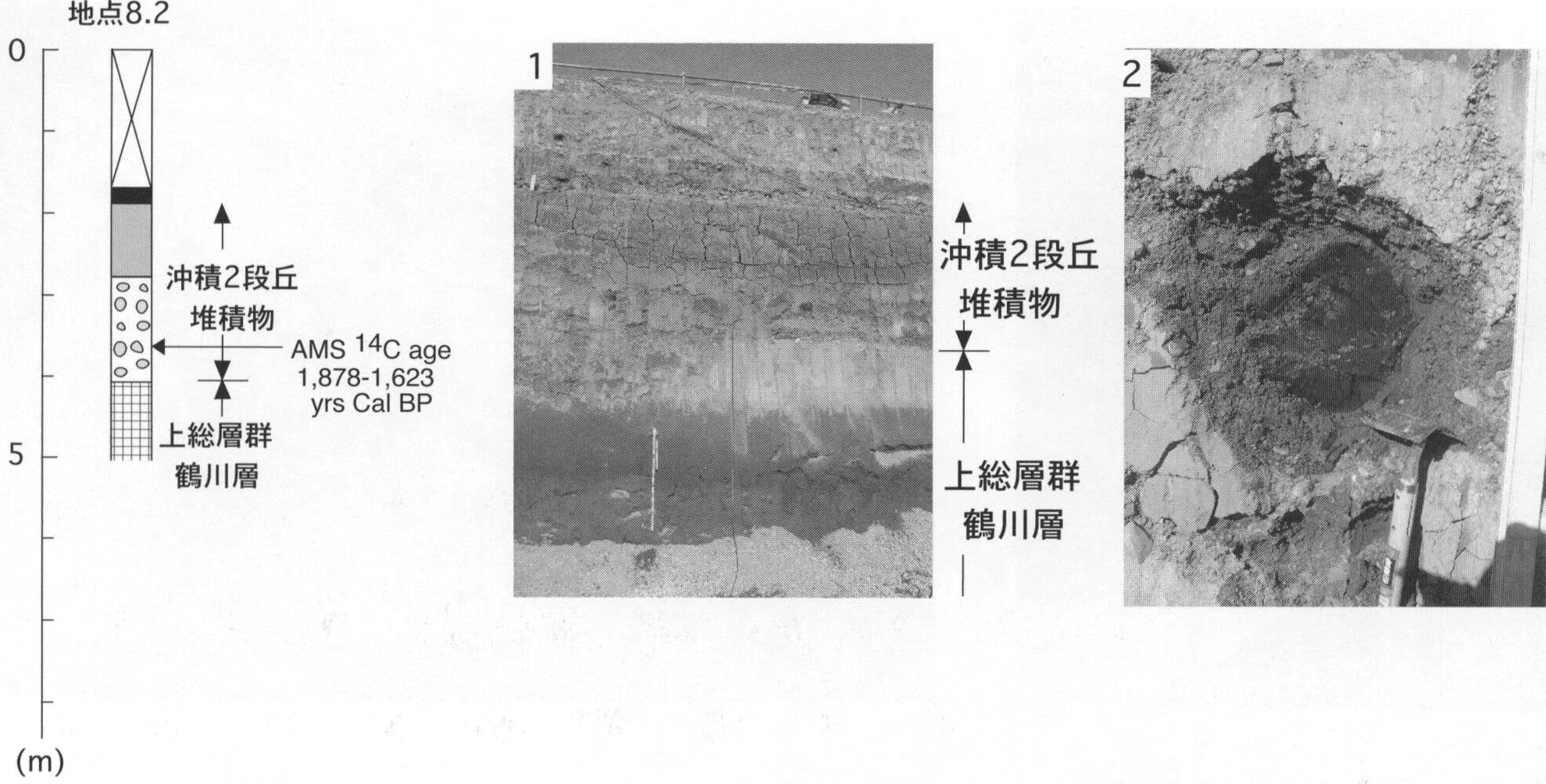 鶴見川では,町田市野津田町の野津田車庫(地点8.2)で,上総層群鶴川層の上位に層厚1.3mの細礫~中礫サイズの円~亜円礫層,層厚90cmの腐植質シルト層,層厚1.1mのローム質シルト層,層厚20cmの腐植土層が重なり,層厚1,7mの盛土層に覆われる(第8.1図の1).下部の円礫~亜円礫層には材化石が多く含まれており(第8.1図の2),その暦年14C年代は1,878-1,623yrs Cal BPであった(第7.1表).川崎市麻生区上麻生から白根にまたがる川崎市下水道局の麻生環境センター付近では材化石を多量に含む砂層,シルト層からなり,3,000±30yrs BPから2,270±30yrs BPの14C年代が得られている(増渕,1992).そこでは,淡水性の珪藻化石,大型植物化石,花粉化石,昆虫化石が産出する(小出,1987;正岡,1987;増渕・正岡,1987;楡井,1987:大沢,1987;増渕,1992;森,1992;上西・山口,1992;吉武・増渕,1992).