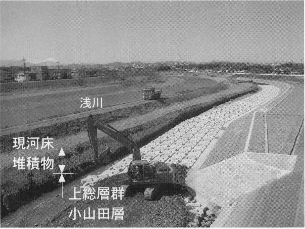 多摩川,浅川,北浅川,南浅川,相模川,中津川の現河床は,網状の河道とその間の砂礫堆が発達する堤内地となっている.そこでは,洪水時に冠水して,砂礫の侵食と堆積が行われる.中津川では,2000年の宮ヶ瀬ダムの建設後に河道が固定化され,砂礫堆が植生に覆われるようになった(久保・須田,2009).これらの河川の現河床堆積物は,門村(1961)の谷底平野低位面の構成層に相当する.そして,淘汰の良い中礫~巨礫サイズの円礫~亜円礫層からなり,砂層を伴う.層厚は数mである.現河床堆積物の例として,日野市上田(地点5.22)における浅川の河床を挙げる.ここでは,河川改修工事の際に,上総層群小山田層の上位に層厚6mの大礫~巨礫サイズの亜円礫層が観察された(第8.3図).そのほかの河川では,現在の流路に沿って,さまざまな粒径の砂礫層が見られる.層厚は数mである.