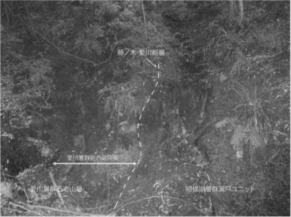 本断層による破砕は相模湖層群側で著しいが,愛川層群の石老山層や中津峡層側でも程度は弱いものの認められる.八王子地域の愛川層群は本断層沿いに北東へ40~70°傾斜しているが,南西方向の傾斜は認められず,本断層沿いにドレイプ褶曲構造は発達していない.高橋ほか(1993)では,断層近傍の小断層系解析が行われている.