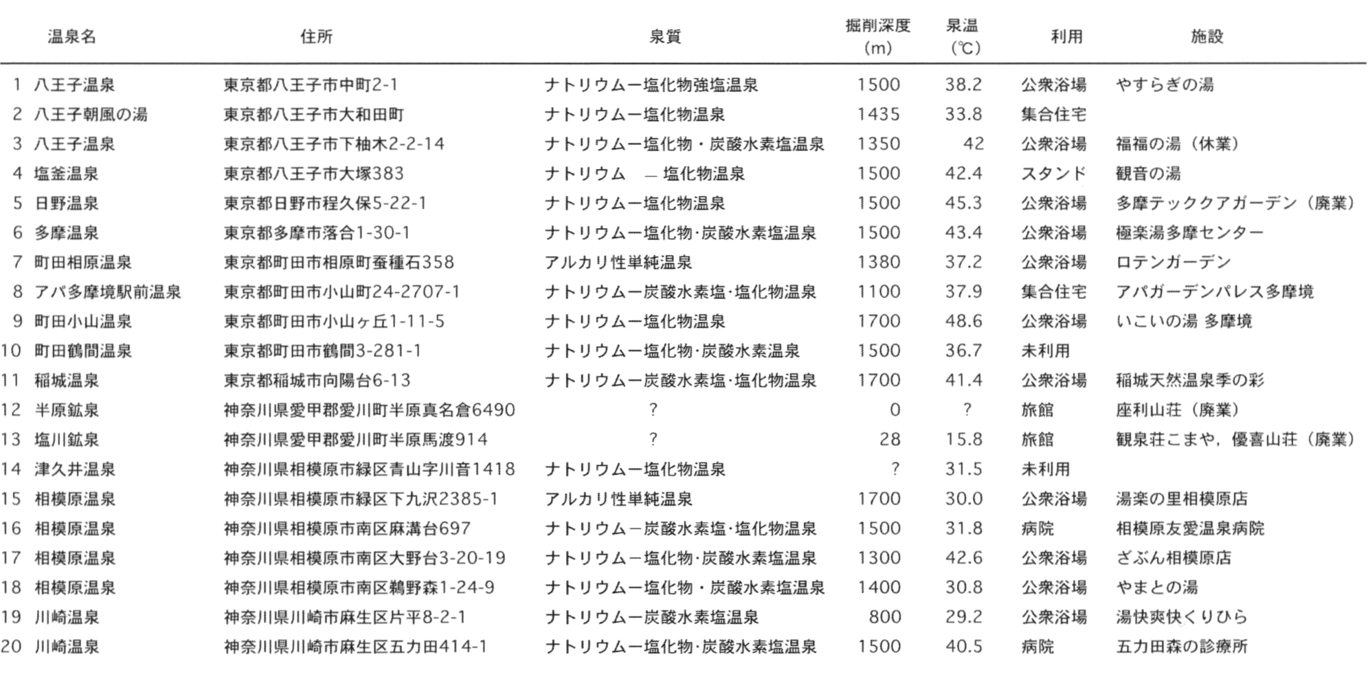 八王子地域の温泉の諸元を第12.1表に示す.ほとんどの温泉水は深井戸からくみ上げられたものであり,自然に湧出するものは半原鉱泉と塩川鉱泉のみである.塩川鉱泉は,金原(1992,2005),関東地方土木地質図編纂委員会事務局(1996b)にも示されている.