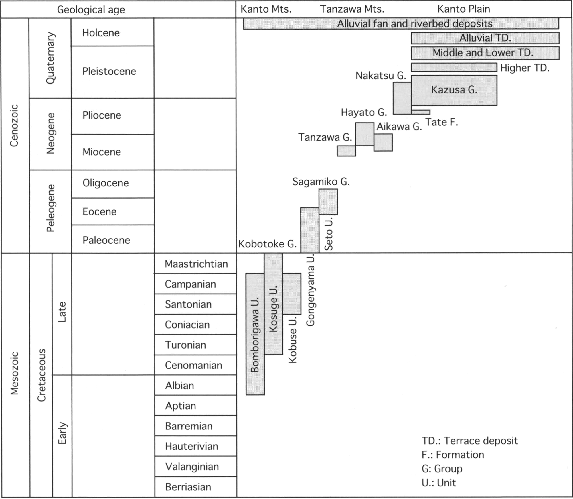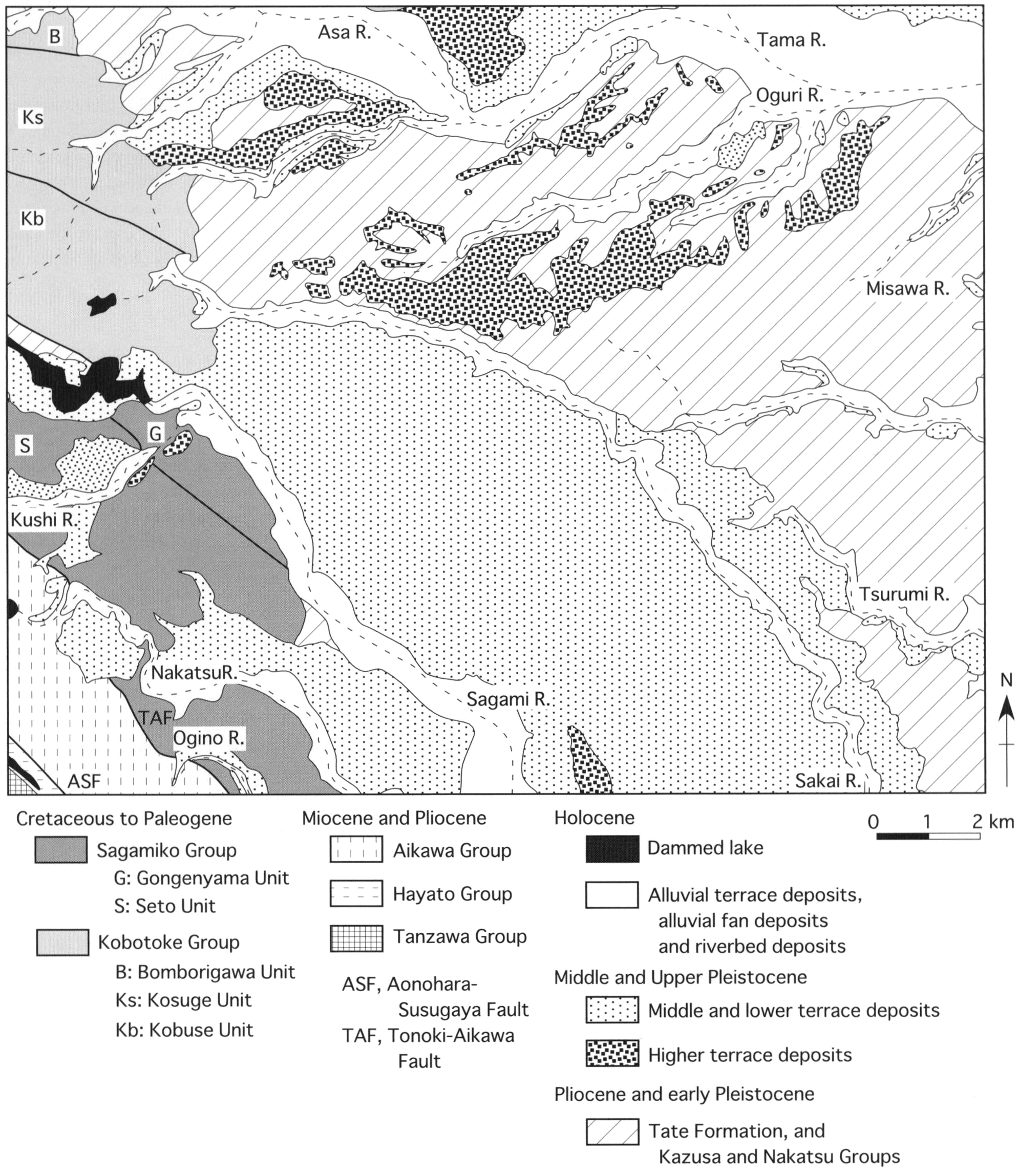Pliocene and Early Pleistocene sediments in the Hachiōji District are exposed in the western margin hills of the Kantō Plain and the uplands along the middle reach of the Sagami and the Nakatsu Rivers. The marine Tate Formation is distributed in the westernmost of the Tama Hills, unconformably overlain by the Kazusa Group. The Kazusa Group is divided into fourteen formations that underlie the Tama, Ongata, Motohachiōji, Funeda and Kasumi Hills. The Terada, Oyabe, Hirayama, Oyamada, Renokoji, Inagi and Dedana Formations in the western Tama Hills are eustasy-influenced marine and fluvial sequences, while the Tsurukawa, Kakio and Ozenji Formations are shallow marine silici-clastic sequences in the central Tama Hills. The Ongata and Motohachioji Formations in the Ongata, Motohachiōji and Funeda Hills are gravelly deposits of tributary and trunk streams. The Nakatsu Group, exposed along the terrace risers, is made of shallow and deep marine sediments divided into the Kosawa, Kanzawa, Shimizu, Otsuka and Shioda Formations.